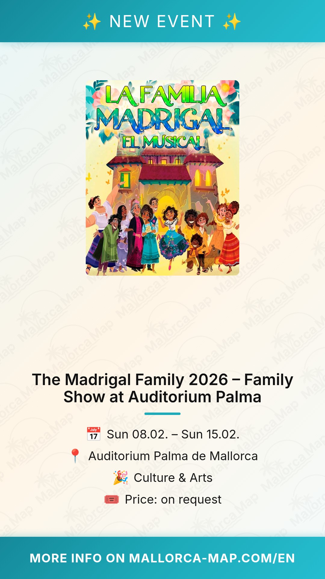 You experience an enchanting afternoon at the Auditorium Palma de Mallorca as the world-famous story of a truly extraordinary family comes to life on stage. On February 8, 2026, the iconic venue on Av. Gabriel Roca transforms into a vibrant Colombian village for the musical tribute The Madrigal Family. This production is a celebration of magic, family bonds, and the unique gifts that lie within every individual. Located directly on the stunning Paseo Maritimo, the theater offers the perfect setting for a high-quality cultural experience that captures the hearts of both children and adults in the heart of Palma.