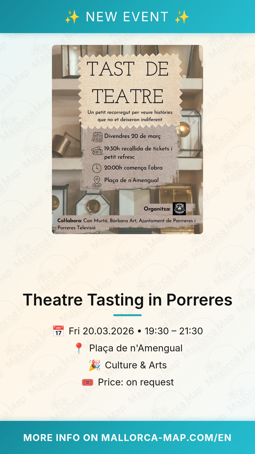 Before the show starts at 19:30, why not arrive a little earlier? Porreres is famous for its local wines and traditional architecture. You can take a stroll through the narrow streets, enjoy a coffee or a glass of local wine at a nearby café, and soak in the authentic island vibe. Make sure to dress comfortably for an outdoor evening. Don't miss this chance to experience the soul of Mallorcan culture through the lens of live theatre. We look forward to seeing you in Porreres for an unforgettable night of drama and delight!