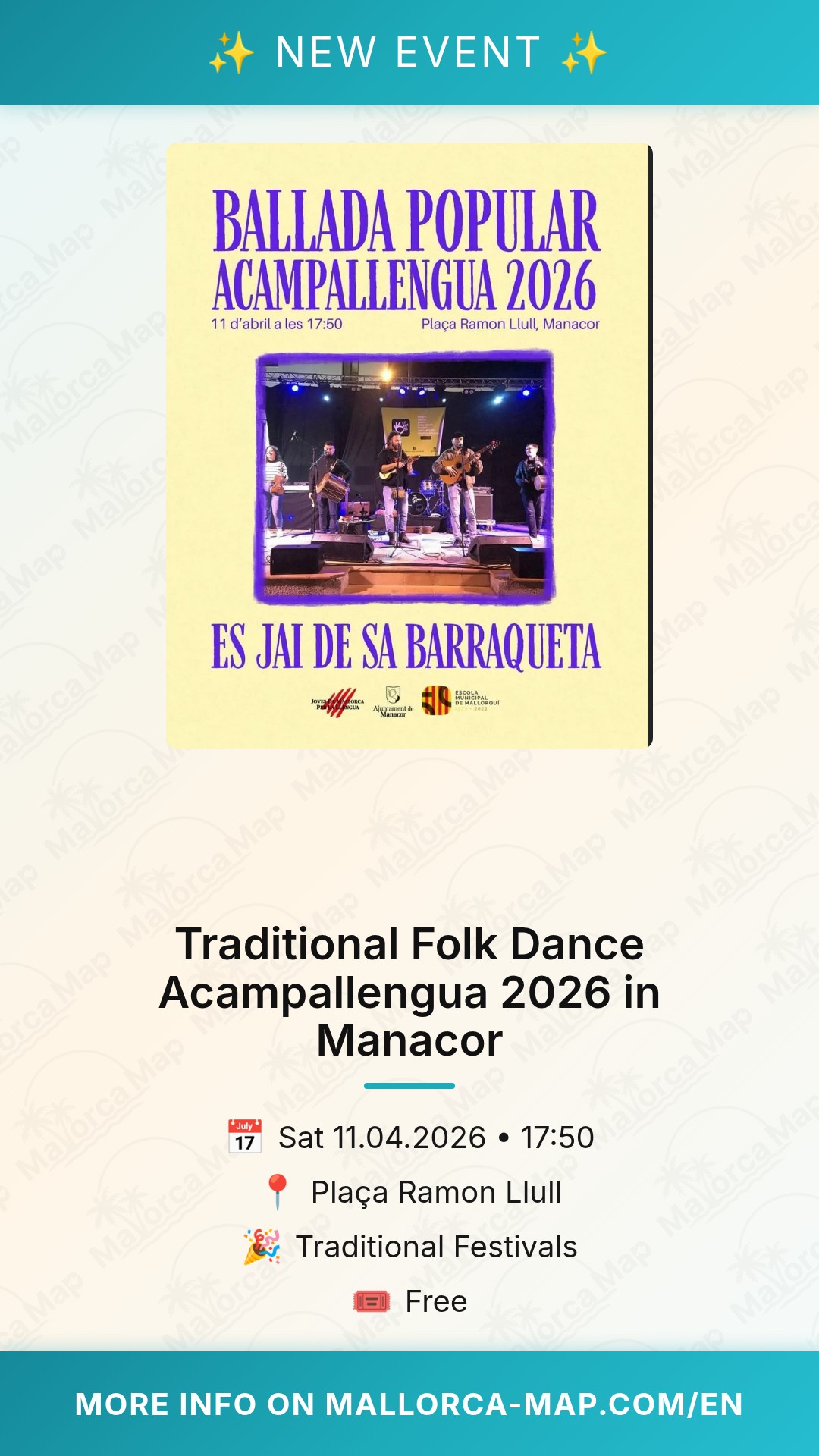 The event starts at 17:50 on April 11th, 2026. Since it takes place in the open-air Plaça Ramon Llull, you can enjoy the fresh spring breeze as the sun begins to set over Manacor. Best of all, entry is completely free, making it a perfect plan for families, couples, or solo travelers wanting to dive deep into the local scene without any cost. Manacor is easily accessible by train or car from Palma, and the square is surrounded by local cafes where you can grab a drink or a snack before the music starts. Don't forget your camera, as the energy of the crowd and the traditional setting are truly sights to behold. Come and join us for an unforgettable evening of Mallorcan tradition and dance!