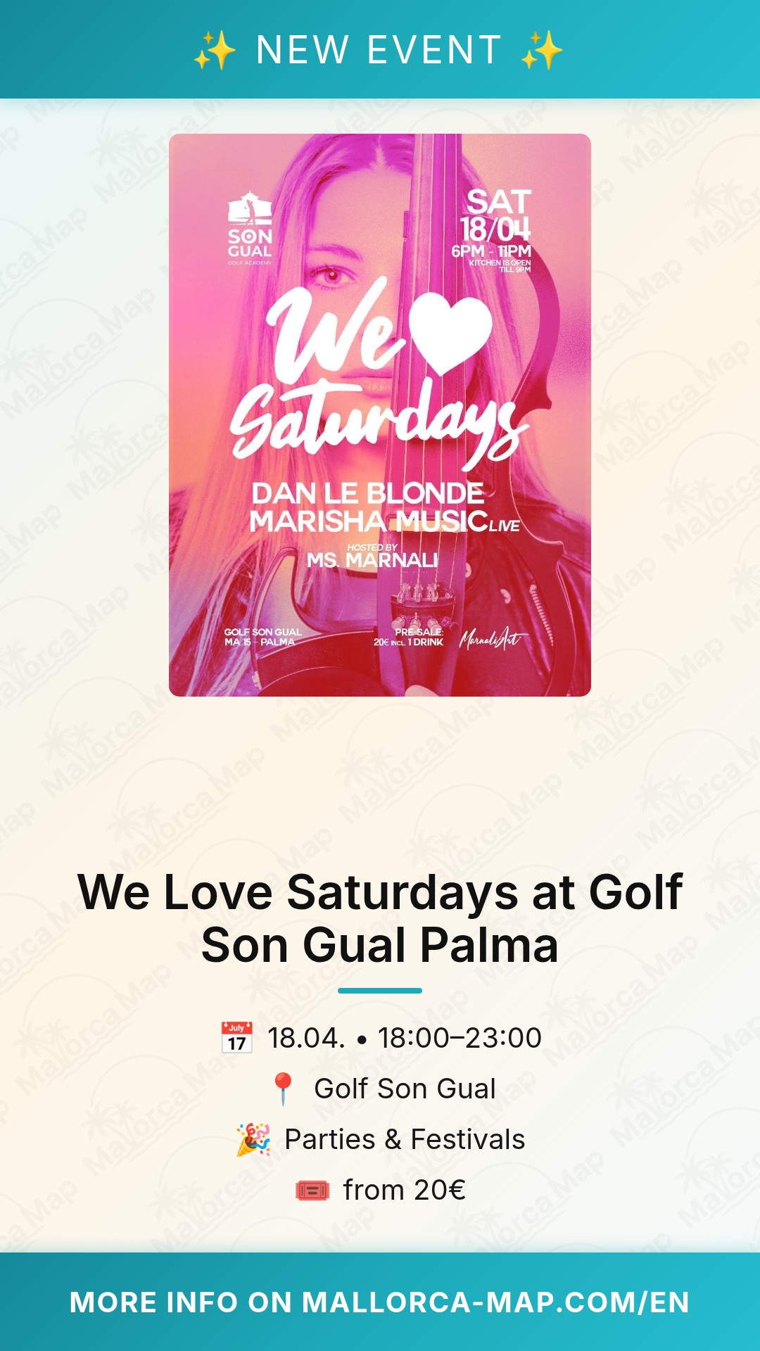 With an entry price of just 20€, it’s an accessible way to enjoy a premium venue and top-tier local talent. Golf Son Gual is conveniently located just off the MA-15, making it an easy trip from the center of Palma or the surrounding areas. Please note that this is an 18+ event, designed for an adult crowd looking for a quality night out. So, gather your friends, put on your favorite outfit, and get ready to dance the night away in one of Mallorca's most beautiful locations. Don't miss out on one of the most talked-about weekly events on the island—come and see for yourself why everyone says "We Love Saturdays!"
