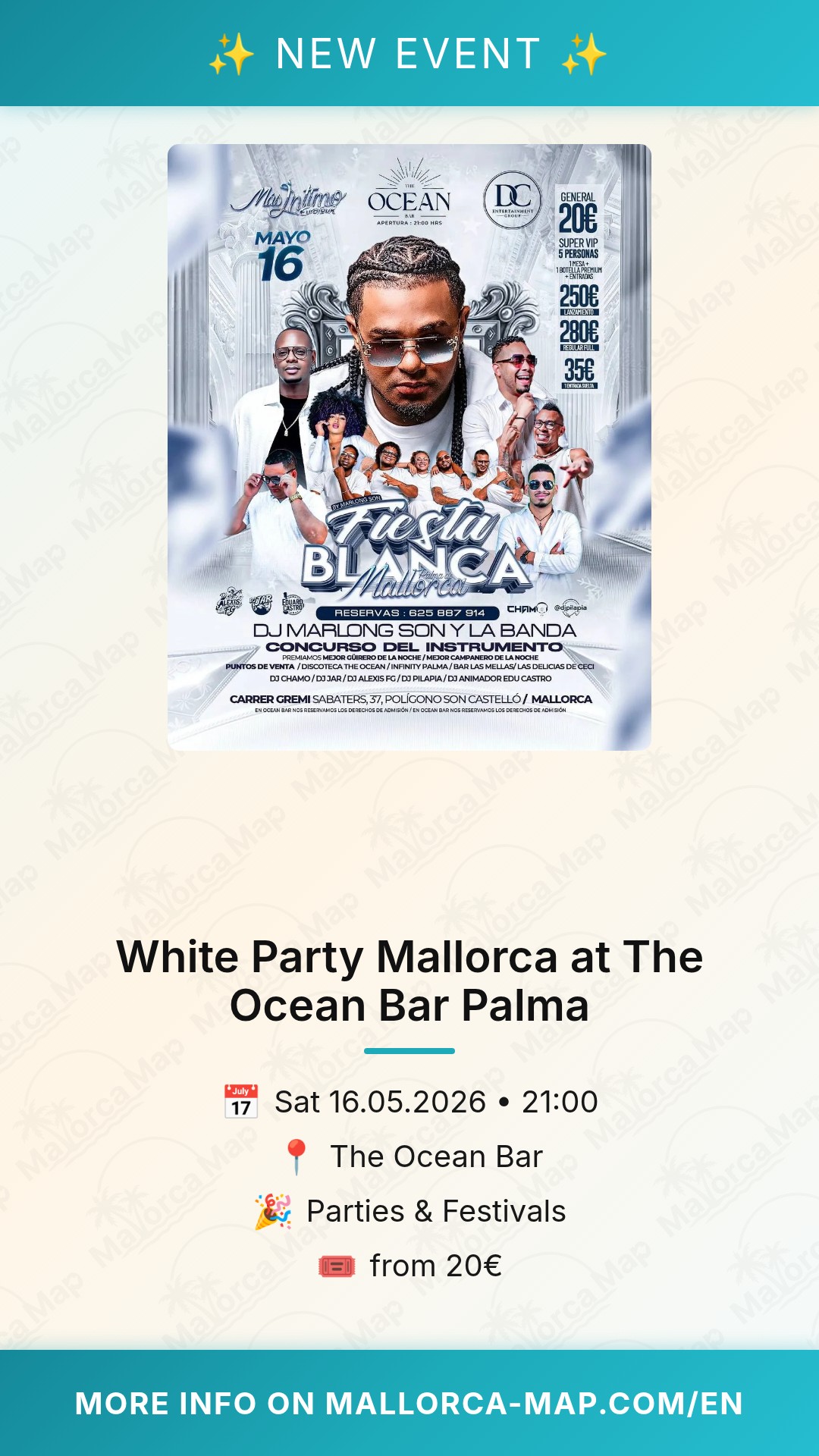 The event takes place at The Ocean Bar, conveniently located on Carrer Gremi Sabaters in the Polígono Son Castelló area of Palma. Doors open at 21:00 on Saturday, May 16, 2026. Tickets range from €20 for general entry up to €280 for premium VIP packages, catering to those who want a more exclusive experience with friends. You can pick up tickets at various local spots like Discoteca The Ocean, Infinity Palma, Bar Las Mellas, or Las Delicias de Ceci. Don't miss out on this iconic Palma night—grab your white outfit, invite your friends, and join us for the Fiesta Blanca!