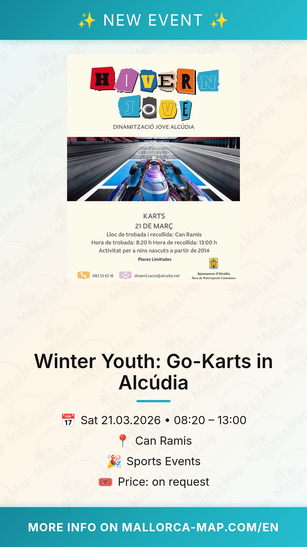 Make sure you don't miss out on this fantastic opportunity to race. While the event is part of a structured youth program, it’s always a good idea to arrive early at Can Ramis to ensure you get the most out of the session. Bring your energy, your competitive edge, and your friends for a morning of racing in one of Mallorca’s most beautiful northern towns. We look forward to seeing you on the track in Alcúdia for an unforgettable Go-Karting experience!