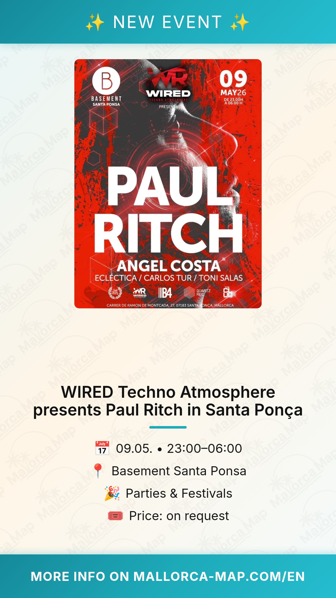The party kicks off at 23:00 and will carry on deep into the night. Whether you are a dedicated techno head or just looking for an unforgettable night out in Mallorca, WIRED Techno Atmosphere presents Paul Ritch is the place to be. Make sure to mark your calendar, gather your crew, and get ready to experience the true power of techno in one of the island's most exciting venues. See you on the dance floor!