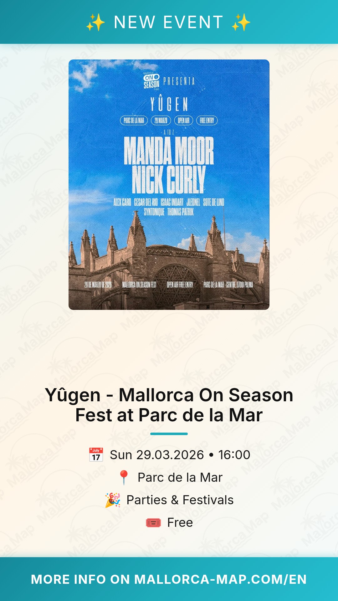 Starting at 4:00 PM on March 29, this event is designed for those who appreciate the "tardeo" style—starting early and making the most of the daylight. The Parc de la Mar offers plenty of space to roam, dance, and soak in the views. Since it is an open-air event with free entry, we recommend arriving early to secure a good spot and fully immerse yourself in the experience. Whether you are a dedicated electronic music fan or just looking for a vibrant atmosphere to enjoy with friends, Yûgen offers a unique opportunity to see top-tier DJs in a stunning public setting without spending a dime on tickets. Don't miss this chance to feel the heartbeat of Palma’s electronic scene. Grab your sunglasses, bring your best energy, and we will see you on the dance floor!