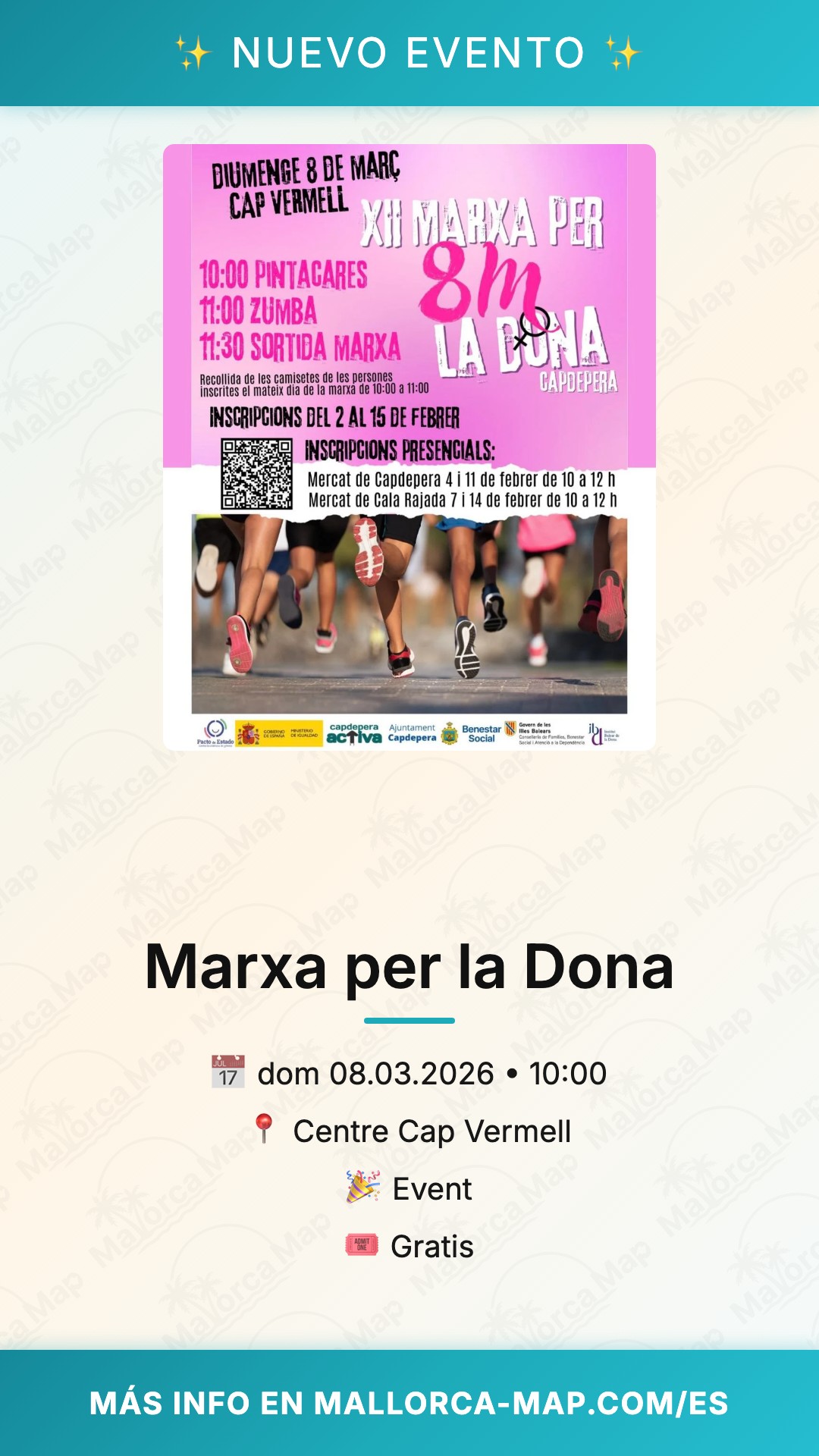 La atmósfera que se vive en esta jornada es sencillamente eléctrica y acogedora a la vez. Verás las calles teñidas de lila y sentirás la fuerza de una comunidad que se apoya mutuamente. Es el evento ideal para familias, grupos de amigos y visitantes que deseen conocer la esencia más auténtica y participativa de Capdepera. El entorno familiar y la energía positiva que desprende la organización hacen que cada paso cuente, convirtiendo una simple caminata en un recuerdo inolvidable de tu paso por Mallorca durante la primavera.