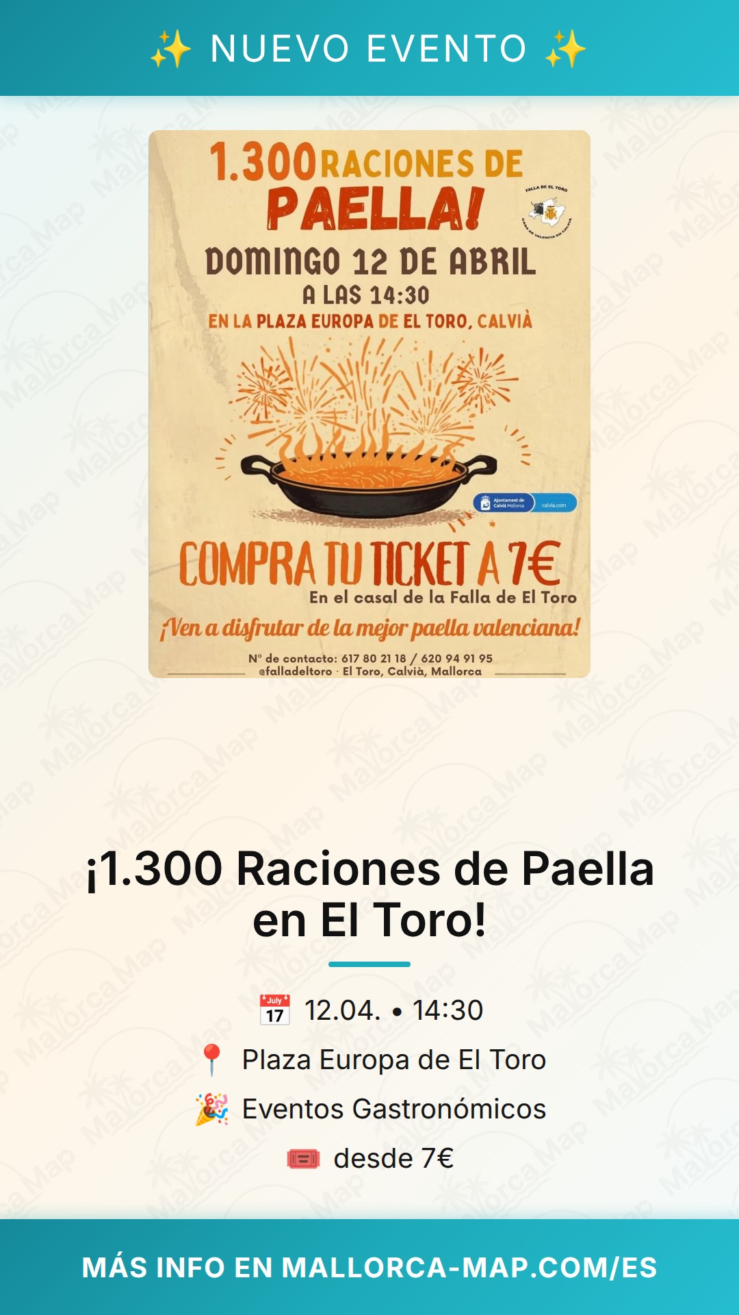 Recuerda que el evento tiene lugar en la céntrica Plaza Europa, un espacio amplio y perfecto para este tipo de encuentros multitudinarios. Ven con hambre, trae a tu familia y prepárate para vivir una jornada llena de sabor y tradición mallorquina mezclada con el arte valenciano. ¡Nos vemos en El Toro para compartir una de las mejores paellas de la temporada!