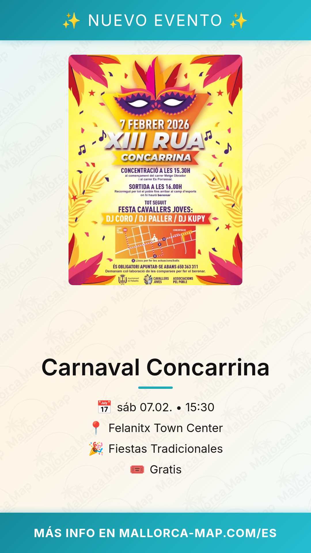Vives la explosión de color y alegría del Carnaval Concarrina en el corazón de Felanitx, una de las citas más emblemáticas del invierno balear. Este próximo 7 de febrero de 2026, las calles de este histórico municipio mallorquín se transforman por completo para acoger la decimotercera edición de su famosa Rua. El desfile comenzará puntualmente a las 15:30 horas, recorriendo la emblemática Carrer Metge Obrador y contagiando a todos los asistentes con un espíritu festivo inigualable. Es el momento perfecto para sumergirse en la energía local y disfrutar de un evento que une a toda la comunidad en una celebración de creatividad y buen humor bajo el cielo de Mallorca.