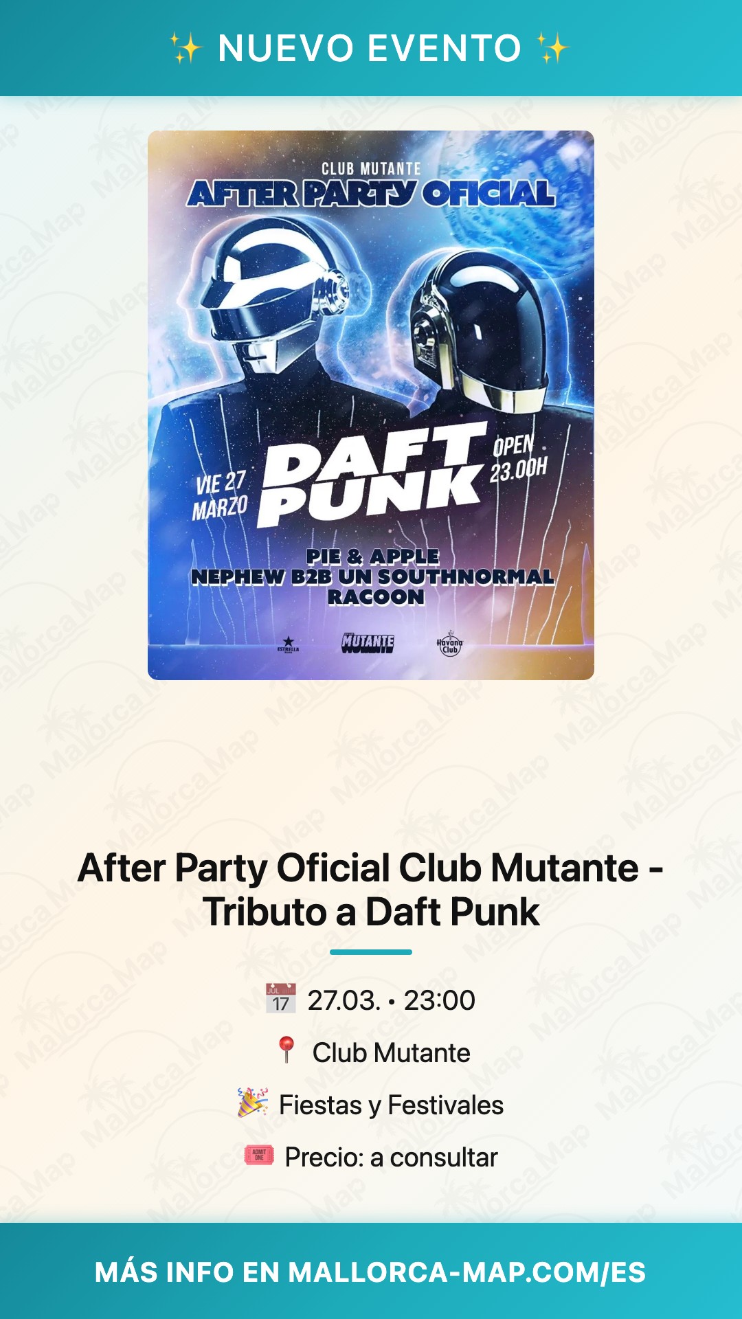 ¿Buscas el plan perfecto para cerrar la noche con broche de oro? Si eres amante de la música electrónica y el legado de los cascos más famosos del mundo, no puedes perderte la After Party Oficial en Club Mutante el próximo 27 de marzo. Este evento promete ser una experiencia sonora única en Palma, rindiendo un merecido tributo a Daft Punk en un ambiente cargado de energía y ritmos envolventes.