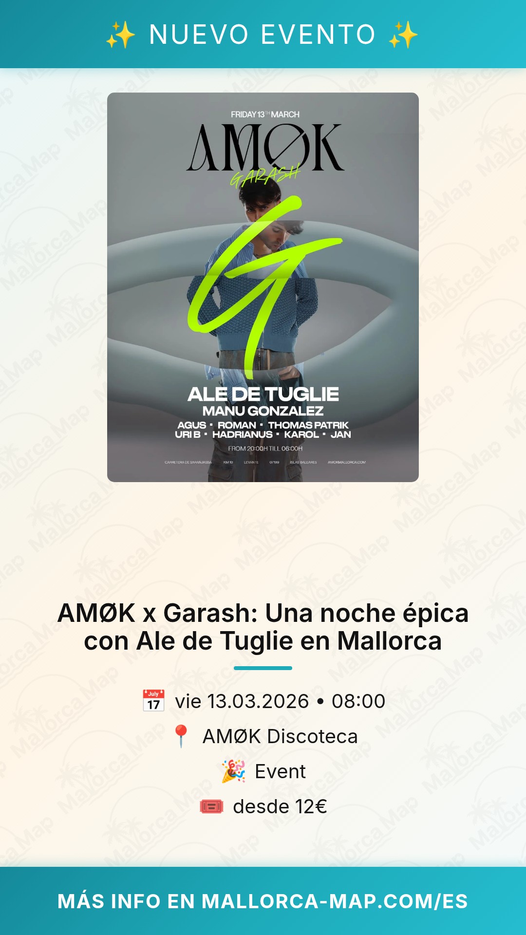 Ale de Tuglie llega a Mallorca para desplegar su característico estilo, conocido por cautivar a las pistas de baile con ritmos envolventes y una curaduría musical técnica y sofisticada. La sinergia entre la propuesta de AMØK y la energía que trae consigo Garash promete transformar esta velada en uno de los puntos de encuentro imprescindibles para los amantes del clubbing en Mallorca. La atmósfera promete ser intensa, con una producción cuidada al detalle para que te pierdas entre los beats hasta que el cuerpo aguante.