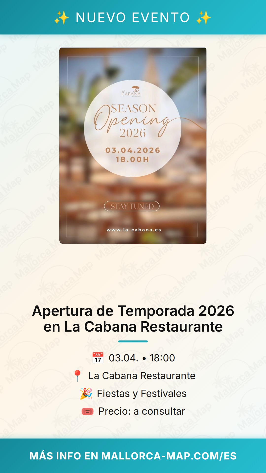No dejes pasar la oportunidad de ser parte de este nuevo comienzo. Asegúrate de marcar bien la fecha en tu calendario y prepárate para vivir una noche llena de estilo, risas y el mejor ambiente mediterráneo. ¡Te esperamos con ilusión en La Cabana Restaurante para brindar juntos por el Season Opening 2026!