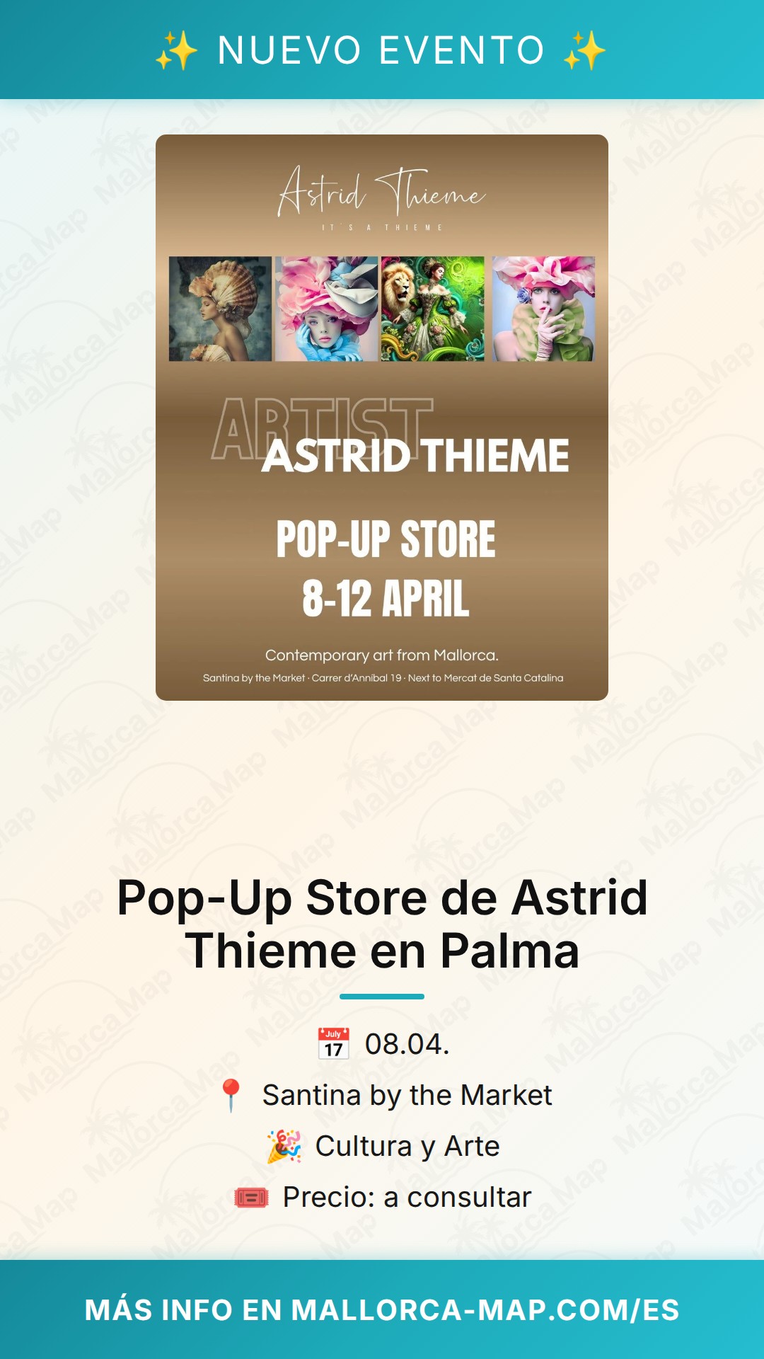 Acércate el 8 de abril de 2026 a Palma, disfruta del barrio y déjate sorprender por el talento de Astrid Thieme. ¡Te esperamos para compartir una jornada llena de arte y buena compañía en un entorno inmejorable! No dejes pasar la oportunidad de llevarte un pedacito de la Mallorca más artística contigo.