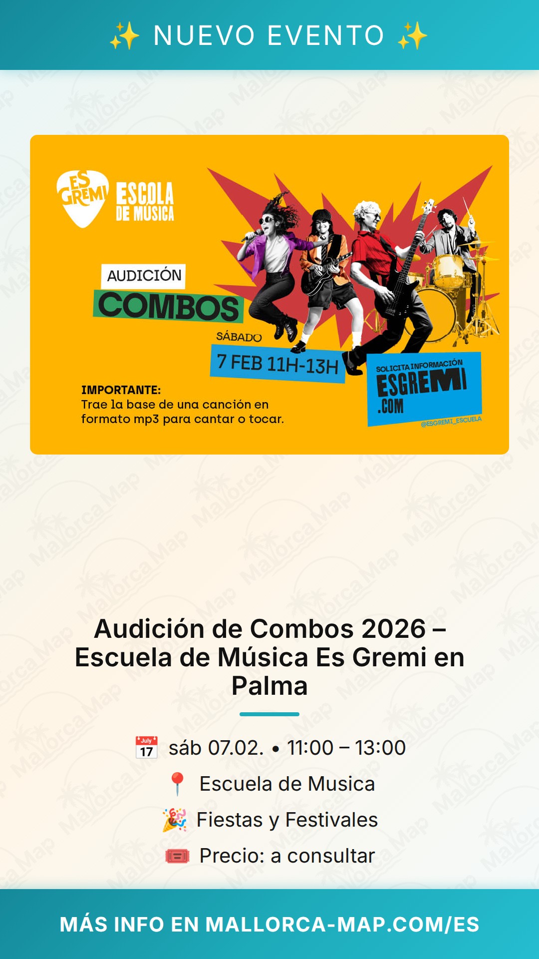 Para participar en esta experiencia transformadora, solo necesitas completar el formulario de inscripción oficial de la escuela indicando tu instrumento y seleccionando el programa de Audición de Combos. Te esperamos en el polígono de Son Castelló para una mañana de música en vivo, aprendizaje e inspiración constante. ¡Atrévete a dar el salto y empieza tu camino como integrante de una verdadera banda de música en la isla!