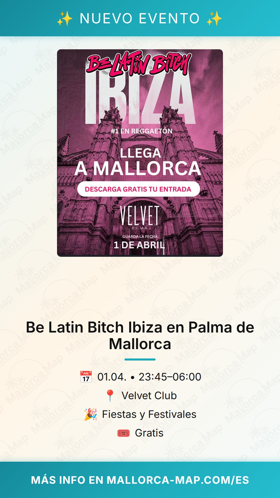 No dejes que te lo cuenten. Ven a vivir en primera persona la llegada de Be Latin Bitch Ibiza a Palma. Recuerda que, aunque la entrada es gratuita, te recomendamos llegar temprano para asegurar tu lugar en la pista, ya que se espera una gran afluencia de público ansioso por disfrutar del mejor reggaetón. ¡Nos vemos en el Velvet Club para una noche que promete ser inolvidable!