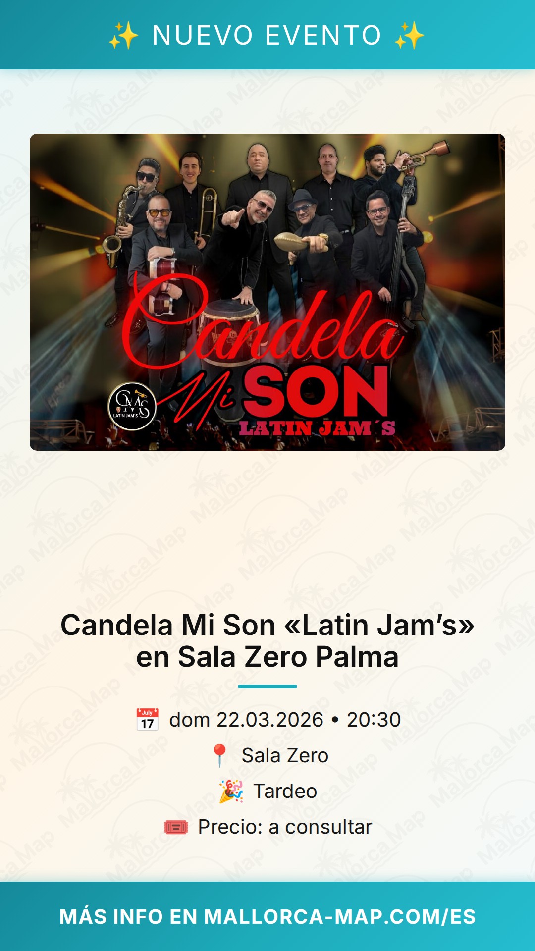 Ubicada en el polígono de Son Castelló, la Sala Zero ofrece el espacio perfecto para este tipo de eventos, con un sonido cuidado y la amplitud necesaria para que puedas bailar con total libertad. No dejes pasar la oportunidad de vivir una auténtica fiesta caribeña sin salir de Palma. Ven con tus amigos, trae tus zapatos de baile y prepárate para una tarde inolvidable de salsa en vivo. ¡Nos vemos en la pista para celebrar la vida a ritmo de Candela Mi Son!