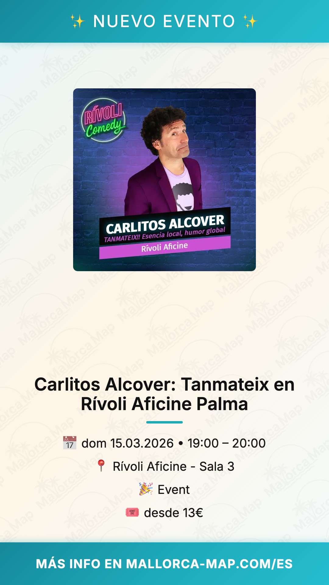 La cita tiene lugar en el emblemático Rívoli Aficine, concretamente en su Sala 3, un espacio que destaca por su excelente acústica y su atmósfera íntima. Situado en la céntrica calle Antoni Marquès, este cine reconvertido habitualmente en escenario cultural ofrece el entorno perfecto para disfrutar de la comedia de cerca. Sentirás la conexión directa con el artista mientras te sumerges en un ambiente relajado y acogedor, rodeado de otros entusiastas del buen humor que buscan una experiencia auténtica en la capital balear.