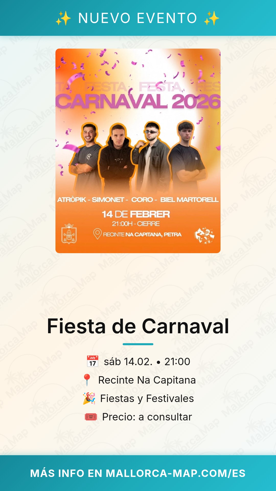 Si buscas comodidad, el acceso al recinto en Petra está bien señalizado y cuenta con opciones de aparcamiento en las zonas colindantes. Te recomendamos llegar temprano para evitar esperas en la entrada y aprovechar al máximo la programación musical desde el inicio. Prepárate para una noche inolvidable llena de risas, buena compañía y el mejor espíritu carnavalero de Mallorca. ¡Es el momento de sacar tu mejor disfraz y unirte a la gran fiesta de Petra!