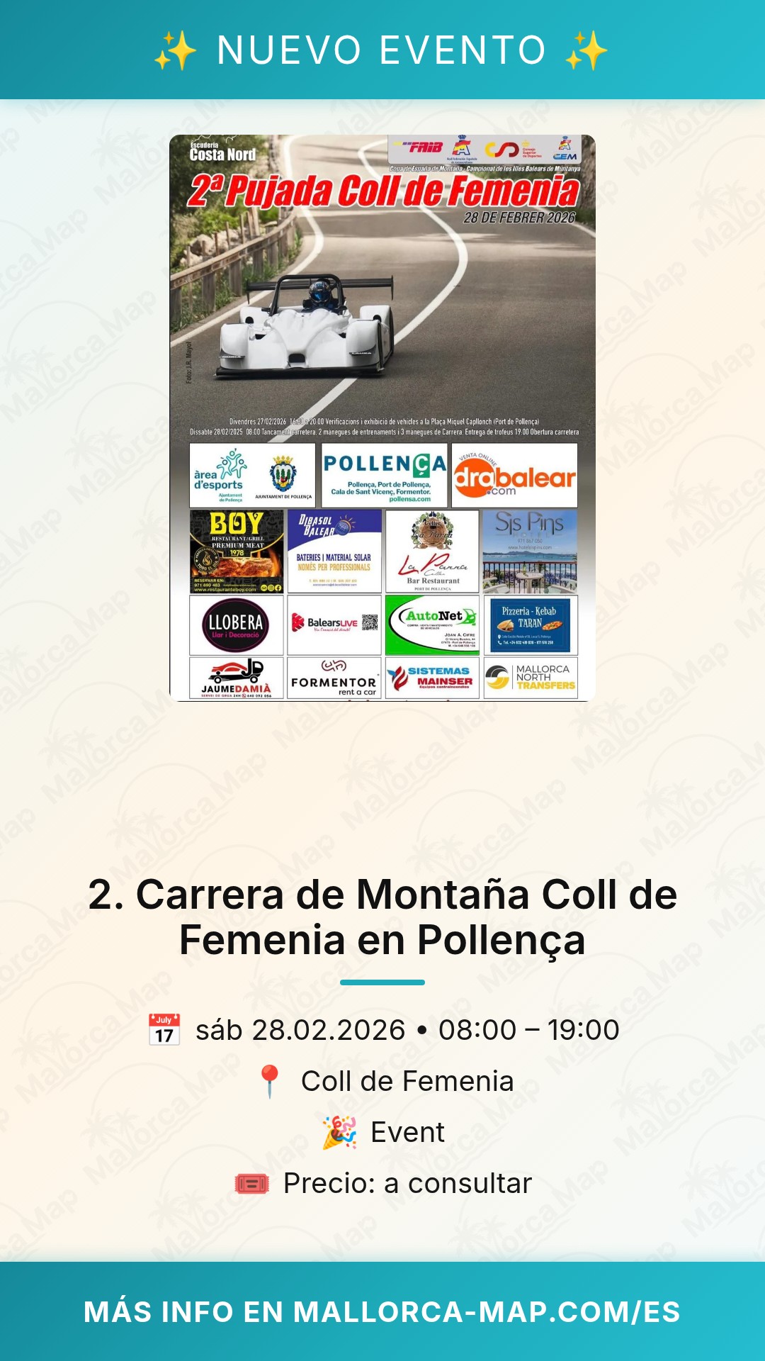Si eres un apasionado del motor y la velocidad, tienes una cita obligada en el norte de Mallorca. El próximo 27 de febrero de 2026, las curvas del emblemático Coll de Femenia volverán a vibrar con la segunda edición de su espectacular carrera de montaña. Este evento, que ya se está consolidando con fuerza en el calendario automovilístico de la isla, promete una jornada cargada de adrenalina, precisión técnica y paisajes impresionantes en el municipio de Pollença. Es el momento perfecto para que sientas de cerca la potencia de los motores en uno de los entornos más bellos de la geografía balear.