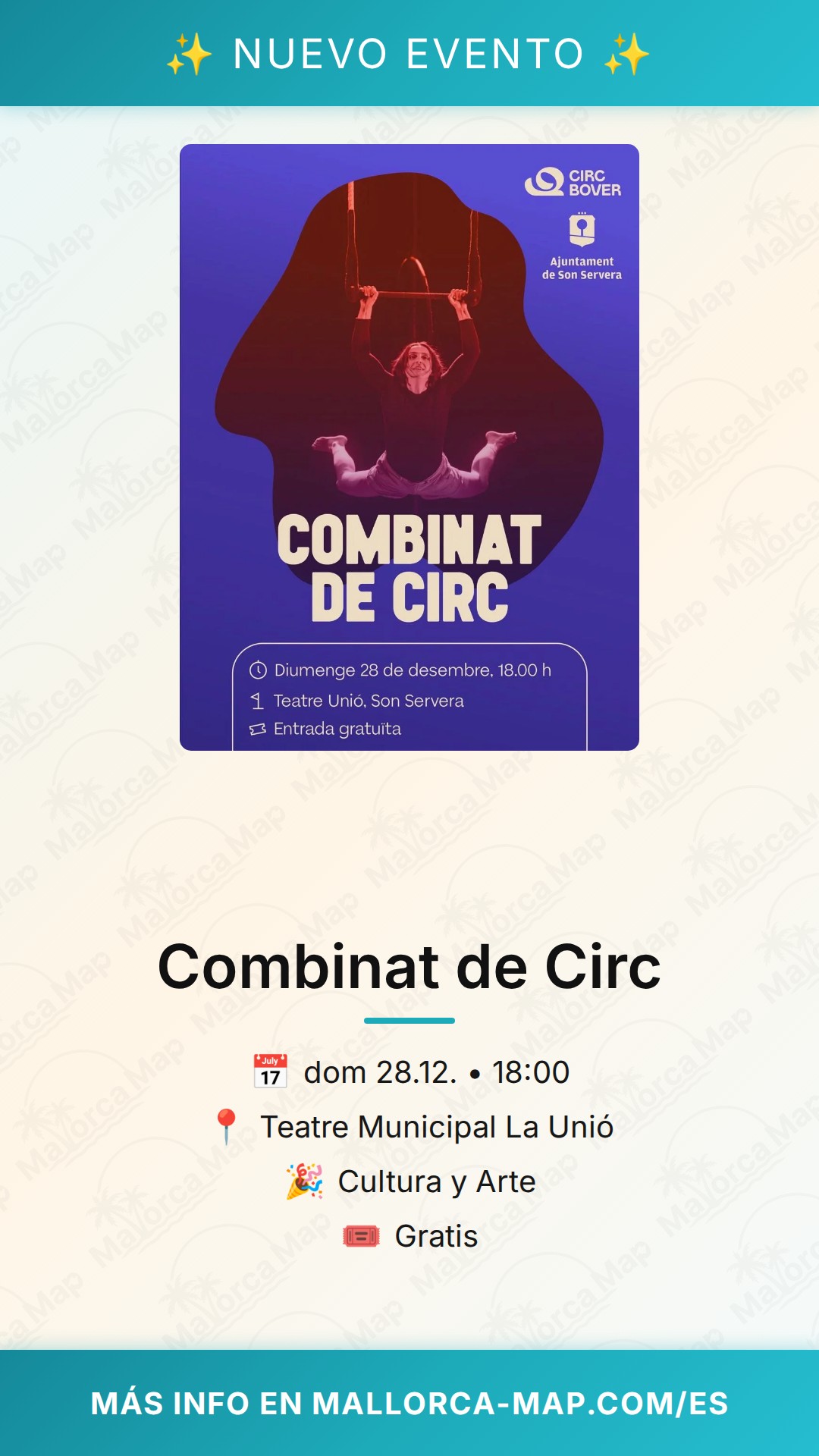 No te pierdas esta entrada gratuita: llega temprano al Teatre Municipal La Unió para el mejor sitio. Reserva tu lugar en nuestra plataforma y vive la magia del circo en Mallorca. ¡Son Servera te espera para un fin de año inolvidable!