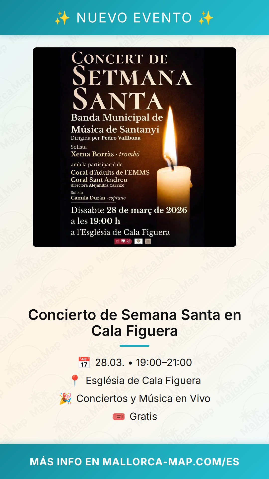 No olvides que el evento comienza puntualmente a las 19:00. Te recomendamos llegar unos quince o veinte minutos antes para encontrar un asiento cómodo y dejarte envolver por el silencio expectante antes de que suene la primera nota. Aprovecha esta ocasión para descubrir Santanyí desde una perspectiva diferente, uniendo la espiritualidad, el arte y la belleza natural de Mallorca en una sola noche. ¡No faltes a esta cita cultural única en la Església de Cala Figuera!