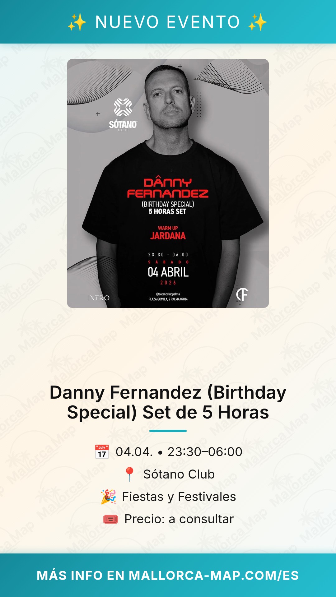 Marca la fecha en tu calendario, avisa a tus amigos y prepárate para celebrar el cumpleaños de Danny Fernandez bailando durante horas. Recuerda que la música empieza a las 23:30, así que llega temprano para no perderte ni un minuto de esta sesión maratoniana. ¡Nos vemos en la pista!