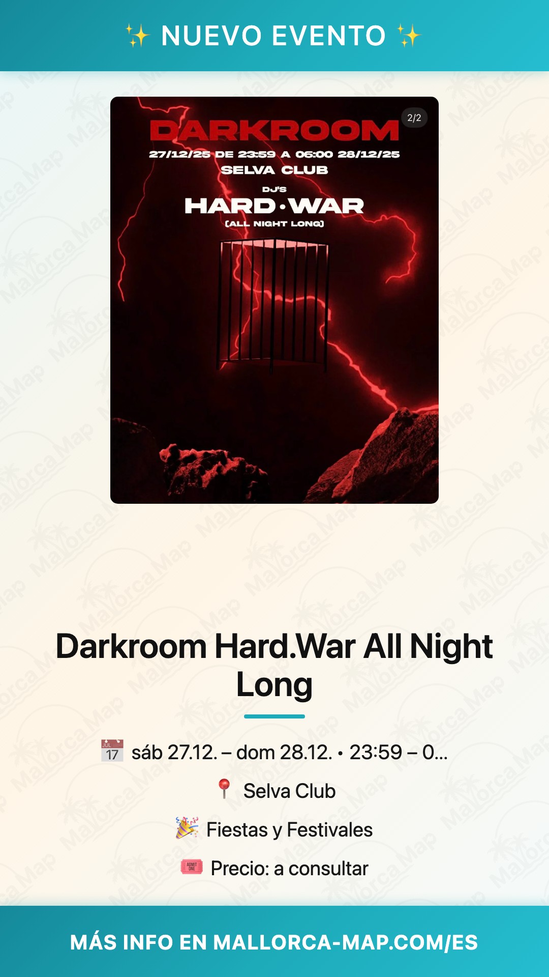 El Darkroom Hard.War All Night Long transforma el Selva Club en Palma de Mallorca en un epicentro de ritmos implacables el 27 de diciembre de 2025. Desde la medianoche hasta las 06:00 del día siguiente, te sumerges en una maratón de techno y schranz con DJ sets que mantienen la energía al máximo. La atmósfera oscura y cargada de bajos profundos captura la esencia del underground mallorquín, atrayendo a amantes de la electrónica dura que buscan una noche sin interrupciones bajo las luces estroboscópicas.