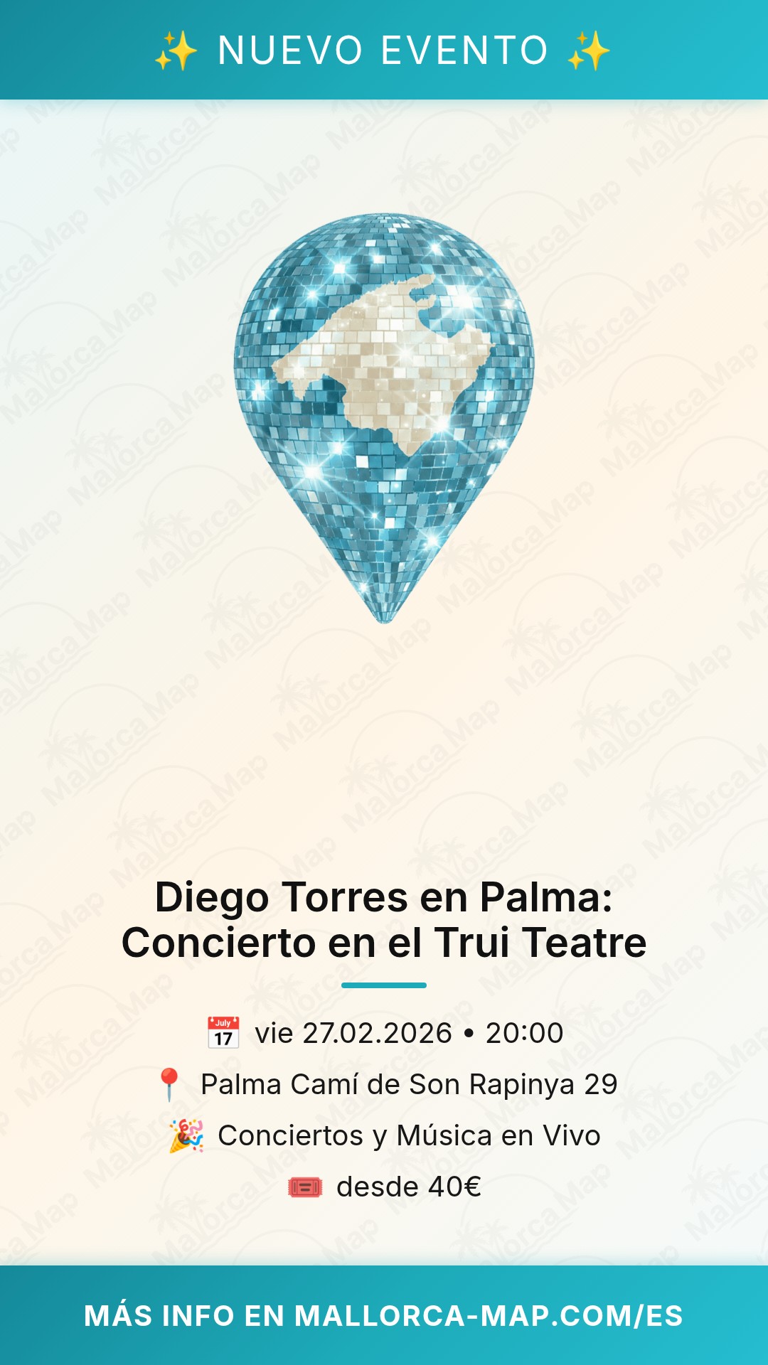 Te recomendamos llegar con antelación para aparcar fácilmente cerca del teatro. Al ser un evento de alta demanda, asegura tu acceso pronto, pues las entradas se agotan rápido para estos conciertos exclusivos. No pierdas la oportunidad de vivir una Nochevieja diferente en Mallorca rodeado de arte. ¡Prepárate para disfrutar y déjate llevar por el gran talento de Diego Torres en directo!