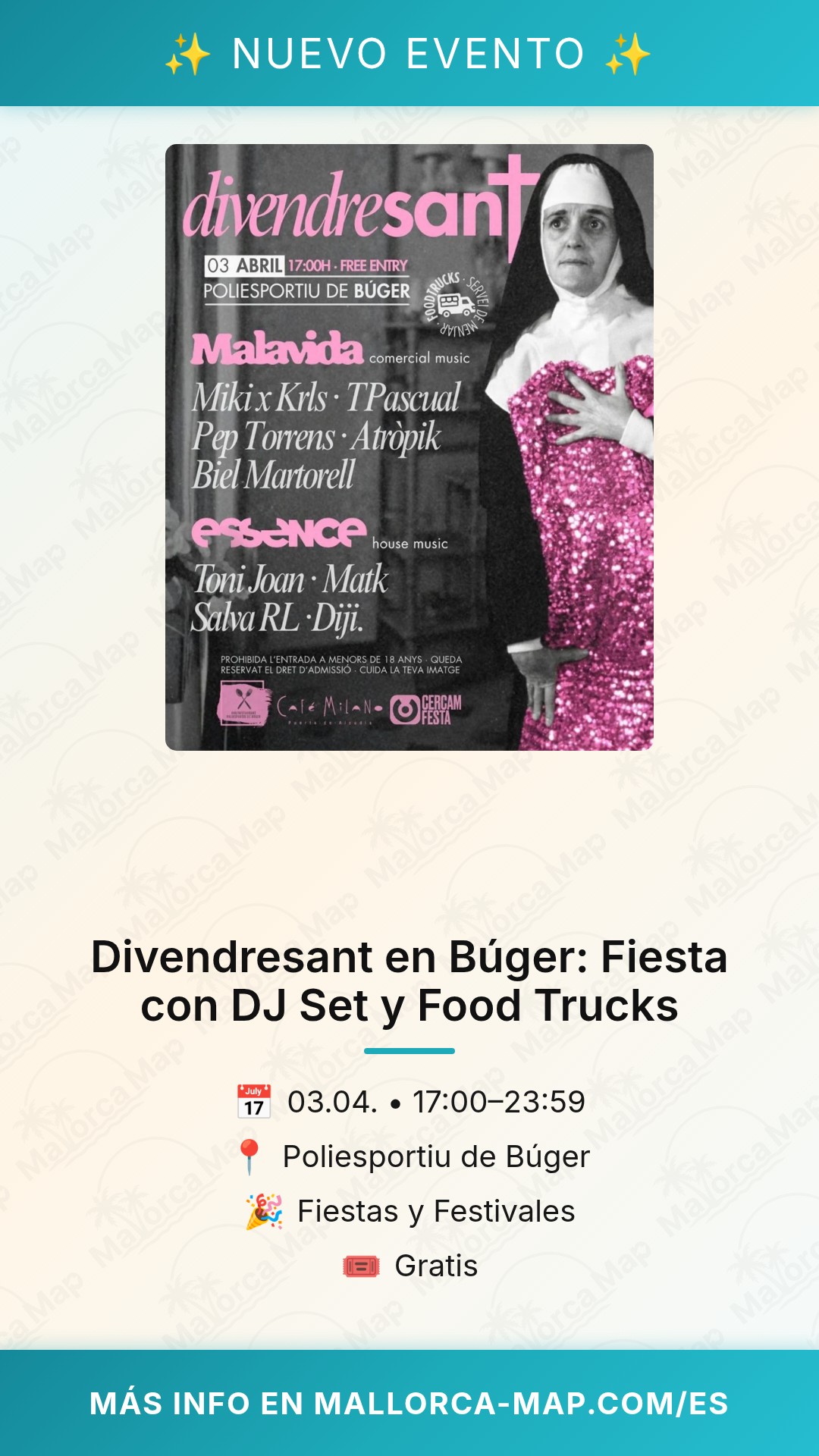 Uno de los puntos más destacados de Divendresant es que ofrece entrada gratuita, facilitando que todos puedan sumarse a la celebración sin barreras. Eso sí, recuerda que el acceso está restringido a mayores de 18 años, lo que garantiza un ambiente enfocado exclusivamente al público adulto que busca calidad musical y un entorno de ocio responsable. El Poliesportiu de Búger, con su amplio espacio, permite disfrutar de una producción técnica de calidad, con sonido e iluminación a la altura de los mejores festivales de la isla.