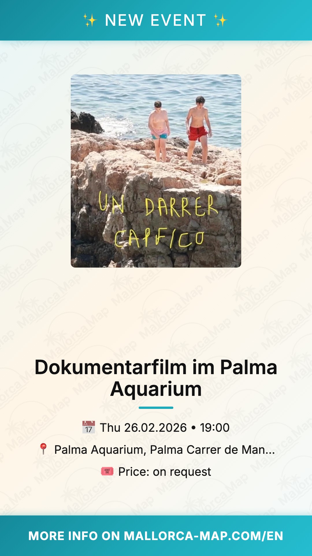 Si estás buscando una actividad cultural enriquecedora para terminar el día en Palma, este documental es la elección perfecta. Ven a aprender, a sorprenderte y a conectar con otros entusiastas del mar en un ambiente relajado y profesional. Asegúrate de llegar con tiempo para encontrar tu sitio y prepárate para una inmersión total en el conocimiento marino. ¡Te esperamos en el Palma Aquarium para compartir esta visión tan necesaria sobre la protección de nuestros océanos!