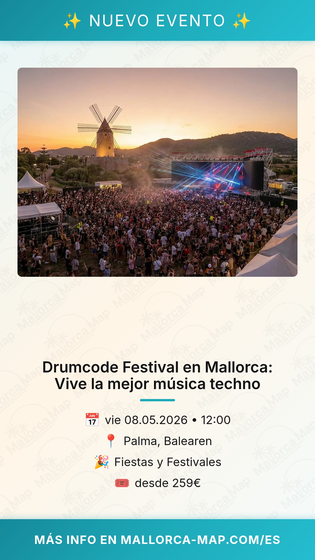 Si eres un amante de la música electrónica, marca el 8 de mayo de 2026 en tu calendario. El Drumcode Festival llega a Mallorca para ofrecerte una experiencia sonora inigualable. Prepárate para sumergirte en una atmósfera vibrante donde el techno es el absoluto protagonista, rodeado de un ambiente único que solo nuestra isla puede ofrecer.