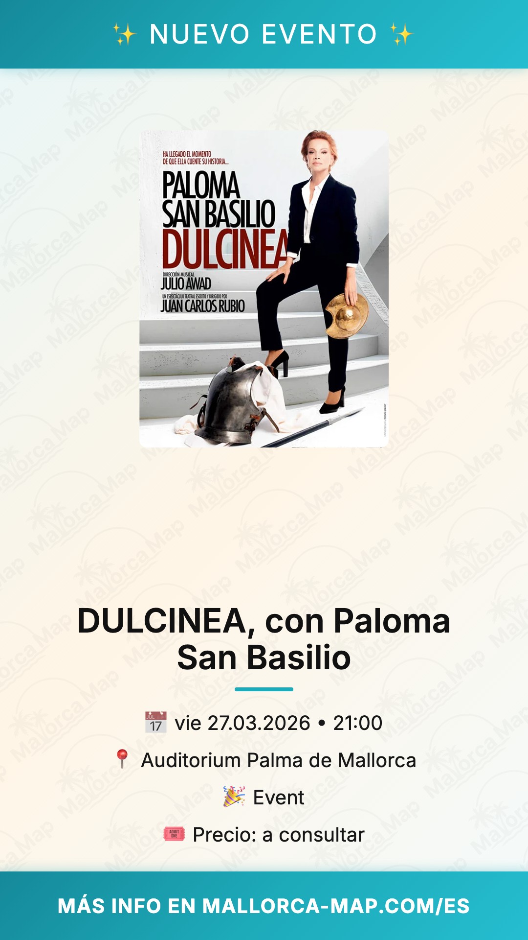 Prepárate para vivir una noche mágica en la capital de la isla con el espectáculo DULCINEA, protagonizado por la icónica Paloma San Basilio. El próximo 27 de marzo de 2026, el Auditorium Palma de Mallorca se vestirá de gala para recibir esta propuesta artística única que combina música y teatro de una forma excepcional. No te pierdas la oportunidad de ver a una de las voces más grandes de España en un escenario inmejorable, donde la elegancia y el talento se fusionan para ofrecerte un recuerdo inolvidable que perdurará por mucho tiempo.