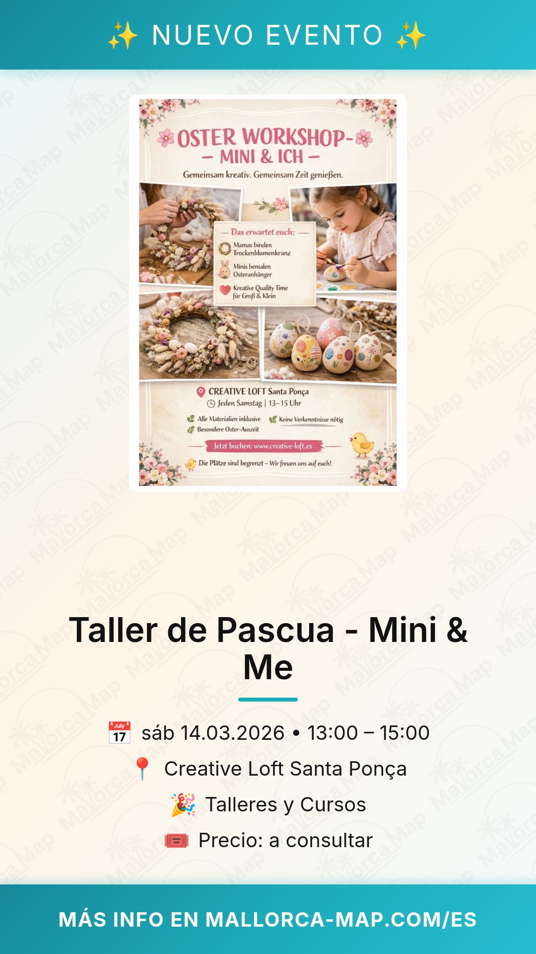 Para llegar al taller, te recomendamos aprovechar las zonas de aparcamiento cercanas a la costa de Santa Ponsa, permitiéndote disfrutar de un agradable paseo antes de comenzar la actividad. Dado que se trata de un taller con plazas limitadas para garantizar una atención personalizada, te sugerimos asegurar tu participación con antelación para no perderte esta cita tan especial. Ven y celebra la Pascua en Mallorca de una forma creativa, llevándote a casa no solo tus creaciones, sino también un recuerdo imborrable de una tarde dedicada exclusivamente al juego y al arte en familia.