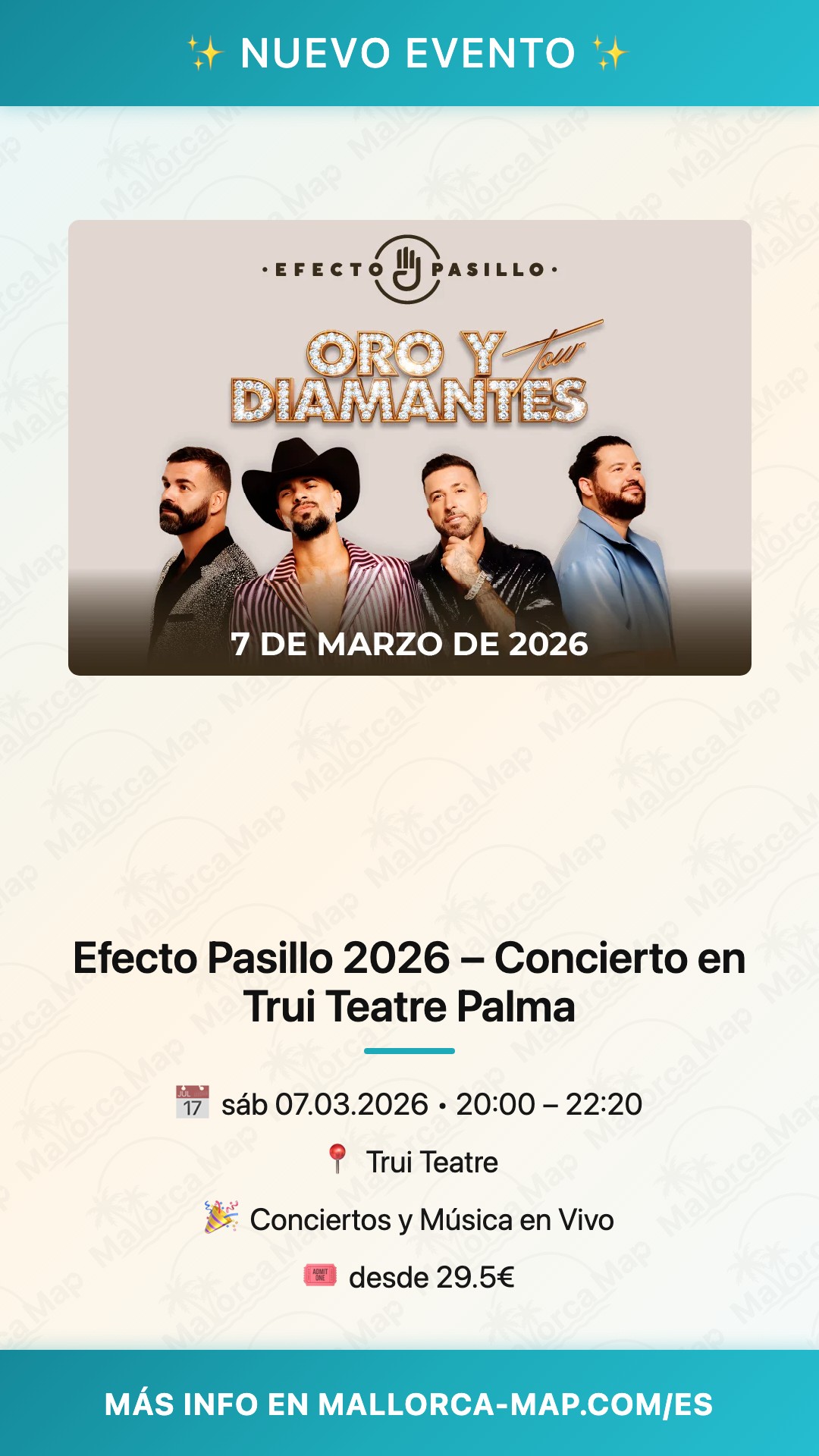 Vives una noche cargada de ritmo y emoción en el corazón de la capital balear. El próximo 7 de marzo de 2026, el Trui Teatre de Palma abre sus puertas para recibir a una de las bandas más queridas del panorama nacional: Efecto Pasillo. En esta ocasión, el grupo canario llega a Mallorca con su flamante gira indoor "Oro y Diamantes", una propuesta que promete transformar el escenario de Camí Son Rapinya en un espacio vibrante donde la música y la cercanía con el público son las auténticas protagonistas. Tras conquistar los grandes recintos al aire libre, la banda elige la atmósfera única de un teatro para inaugurar el año con una energía renovada y un sonido mucho más íntimo.