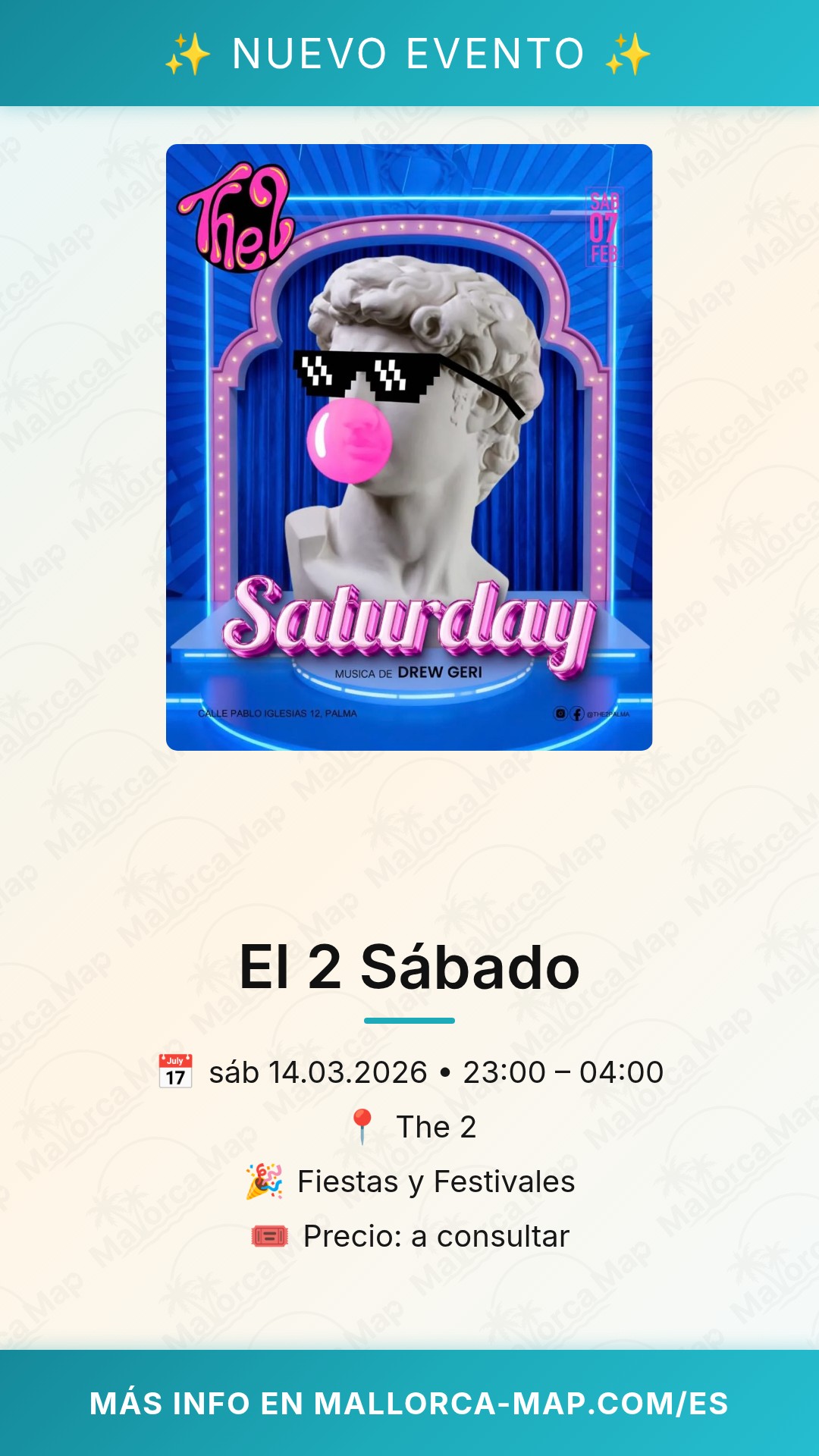 Prepárate para vivir una noche inolvidable en Palma con el evento El 2 Sábado el próximo 7 de febrero de 2026. Si buscas la mejor combinación de música actual y un ambiente vibrante en el corazón de la ciudad, este es tu sitio. La cita comienza a las 23:00 en la calle Pablo Iglesias, convirtiéndose en el plan perfecto para quienes desean exprimir el fin de semana al máximo con ritmos envolventes y mucha energía positiva.