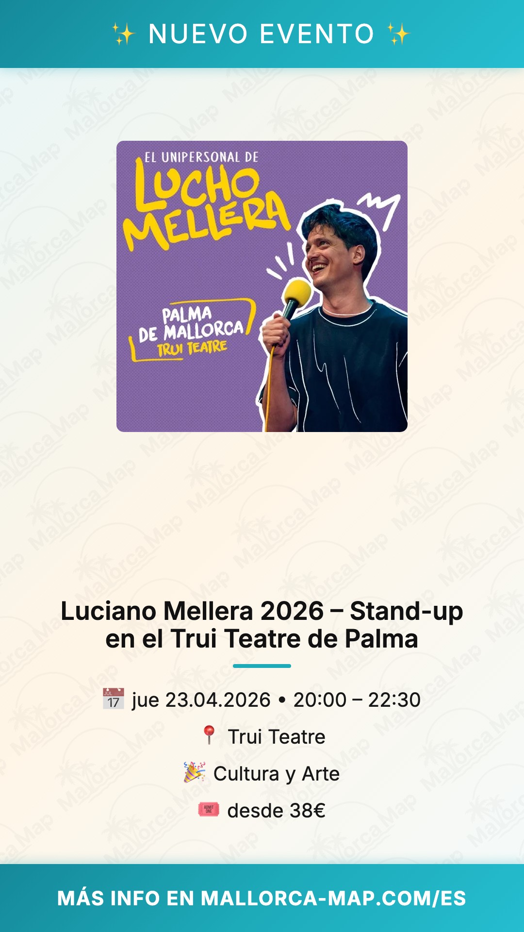 Para asegurar tu lugar en este evento de cultura y entretenimiento, te recomendamos planificar tu llegada con antelación, ya que la zona cuenta con buenas conexiones de transporte público desde el centro de Palma. Aunque el acceso es mediante entradas de pago, el rango de precios se mantiene moderado para la calidad del artista internacional que se presenta. No dejes pasar la oportunidad de presenciar uno de los mejores monólogos del año en la isla y prepárate para reír a carcajadas con el carisma de Luciano Mellera.