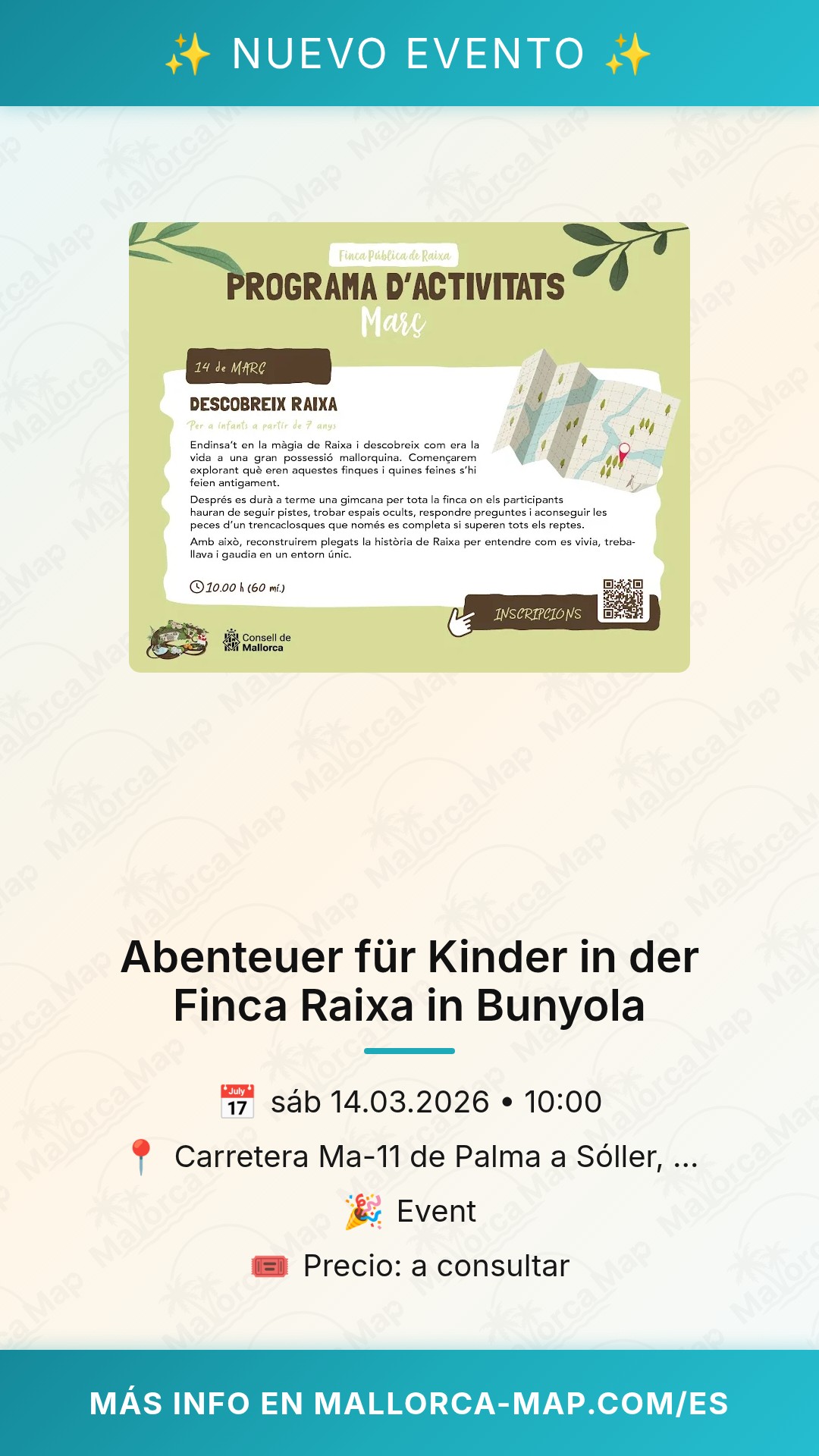 Verpasse nicht die Chance, deinen Kindern diese besondere Seite Mallorcas näherzubringen. Pack bequeme Schuhe ein und sei dabei, wenn Raixa seine verborgenen Ecken für kleine Entdecker öffnet. Wir freuen uns darauf, gemeinsam mit euch die Geschichte dieses besonderen Ortes neu zu entdecken und die Rätsel der Vergangenheit zu lösen. Komm vorbei und erlebe einen Tag voller Spaß, Lernen und Abenteuern in einer der schönsten Kulissen der Insel!