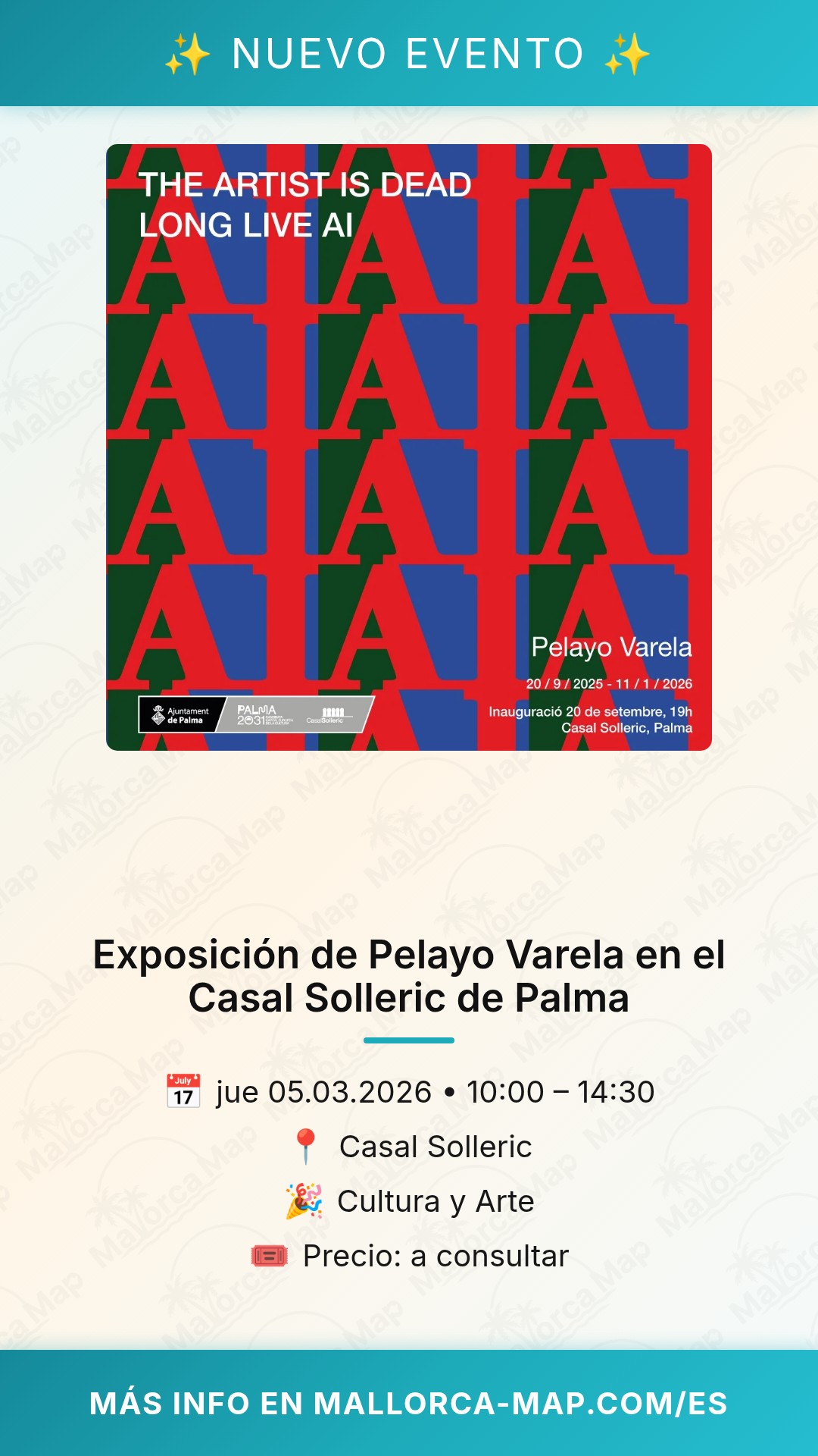 Al entrar en el patio del Casal Solleric, ya sientes esa mezcla de historia arquitectónica mallorquina y vanguardia artística. Esta exposición es perfecta tanto si eres un experto en arte contemporáneo como si simplemente tienes curiosidad por saber cómo la tecnología está transformando nuestra cultura. La obra de Pelayo Varela destaca por su capacidad de conectar contigo, planteando preguntas que todos nos hacemos hoy en día: ¿Puede una máquina tener alma? ¿Dónde termina el código y empieza la inspiración?