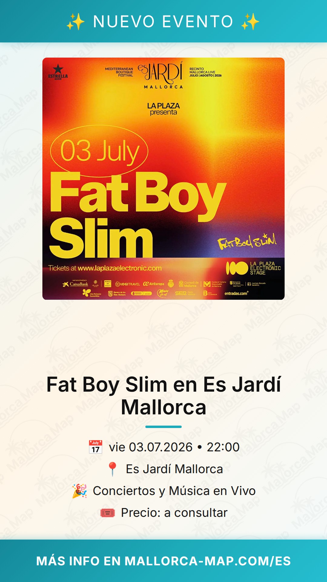 Prepárate para una de las noches más vibrantes del verano en Mallorca. El legendario Fat Boy Slim llega a Es Jardí, en Calvià, para ofrecerte una sesión que promete ser inolvidable. Si eres amante de la música electrónica y de los ritmos que definieron una era, esta es tu cita obligada el 3 de julio de 2026. Ubicado en el idílico entorno de Es Jardí Mallorca, este evento forma parte del Mediterranean Boutique Festival, un concepto que une la mejor música con un ambiente exclusivo y relajado.