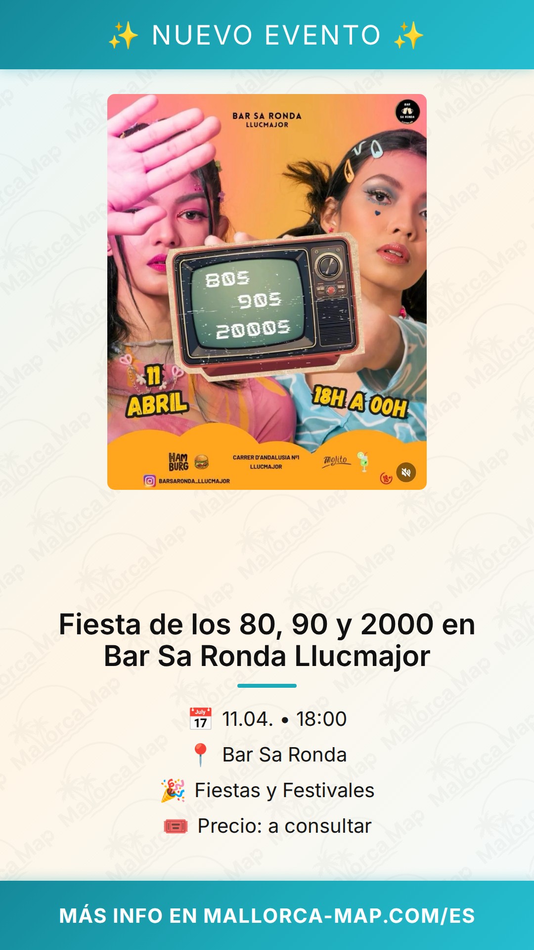 Ya sea que vengas por la nostalgia de los sintetizadores de los 80, la rebeldía de las bandas de los 90 o la frescura de los hits de los 2000, aquí encontrarás tu lugar y gente con tus mismos gustos. No te preocupes por el plan de este sábado; ya lo hemos organizado todo por ti. Solo tienes que traer tus ganas de pasarlo bien y, si te sientes creativo, algún detalle en tu vestimenta que rinda homenaje a tu década favorita. Llucmajor te espera para vivir una de esas noches mágicas que se comentan durante semanas. ¡Nos vemos en la pista de baile del Bar Sa Ronda para celebrar juntos los mejores años de la música!