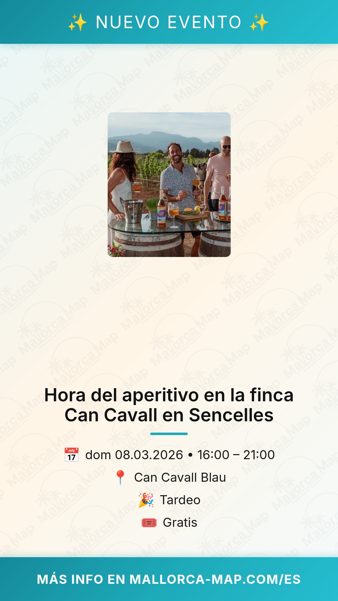 No es necesario realizar una reserva previa para pasarte a saludar y disfrutar del entorno. La entrada es gratuita, lo que facilita que puedas decidirte en el último momento. Si te encuentras cerca de Sencelles o si simplemente te apetece una pequeña excursión dominical al centro de la isla, la finca Can Cavall te espera con los brazos abiertos, una hospitalidad genuina y una copa bien fría. ¡Ven a descubrir este secreto local y haz que tu domingo sea inolvidable!