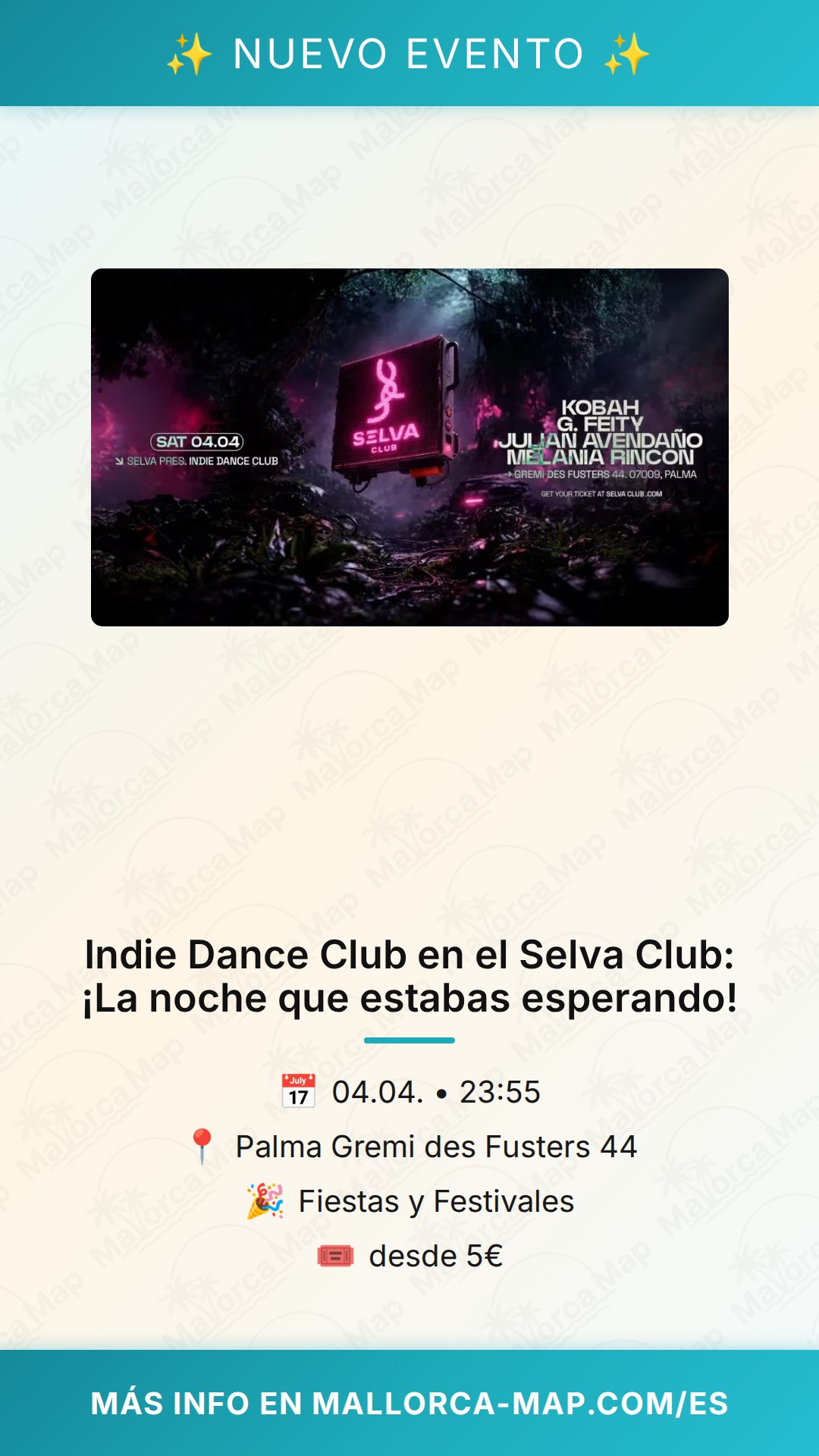 Te esperamos el 4 de abril para compartir buena música, risas y el mejor ambiente de Mallorca. ¡Prepara tus mejores pasos y únete a la comunidad del Indie Dance Club! Es el plan perfecto para recargar energías y vivir la noche mallorquina de una forma diferente y auténtica. ¡No dejes que te lo cuenten y ven a experimentar el ritmo por ti mismo!