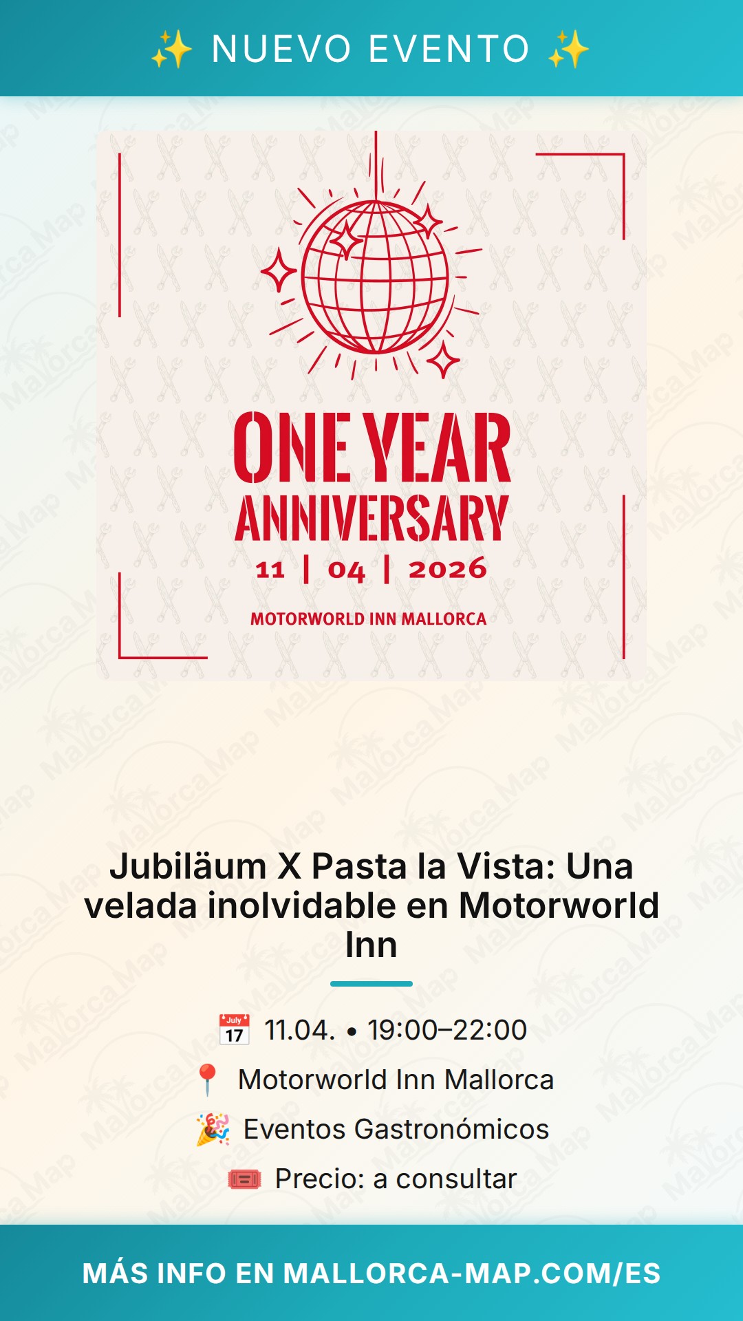 ¡Prepárate para una noche especial! El próximo 11 de abril de 2026, te invitamos a celebrar el Jubiläum X Pasta la Vista en el emblemático Motorworld Inn Mallorca. Si eres amante de la buena comida y buscas un ambiente único donde los motores y la gastronomía se dan la mano, este evento es la cita perfecta para ti.