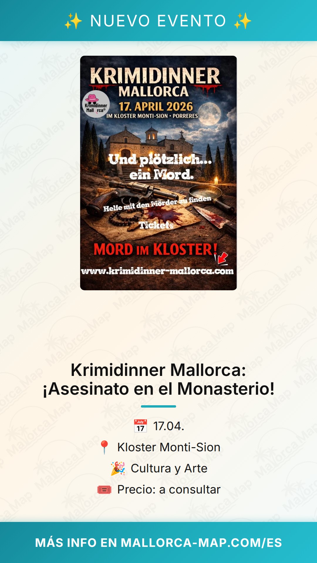 No dejes que te lo cuenten. Ven a Porreres y demuestra tus dotes de investigador. La combinación de la intriga teatral, el ambiente del monasterio y el sabor de la cocina local harán que esta noche sea uno de tus mejores recuerdos en Mallorca. Asegúrate de reservar tu sitio con antelación, ya que las plazas para este tipo de eventos exclusivos suelen agotarse rápido. ¿Serás capaz de descubrir quién es el asesino antes de que se sirva el postre? ¡Te esperamos en el Kloster Monti-Sion para una noche de suspense absoluto!