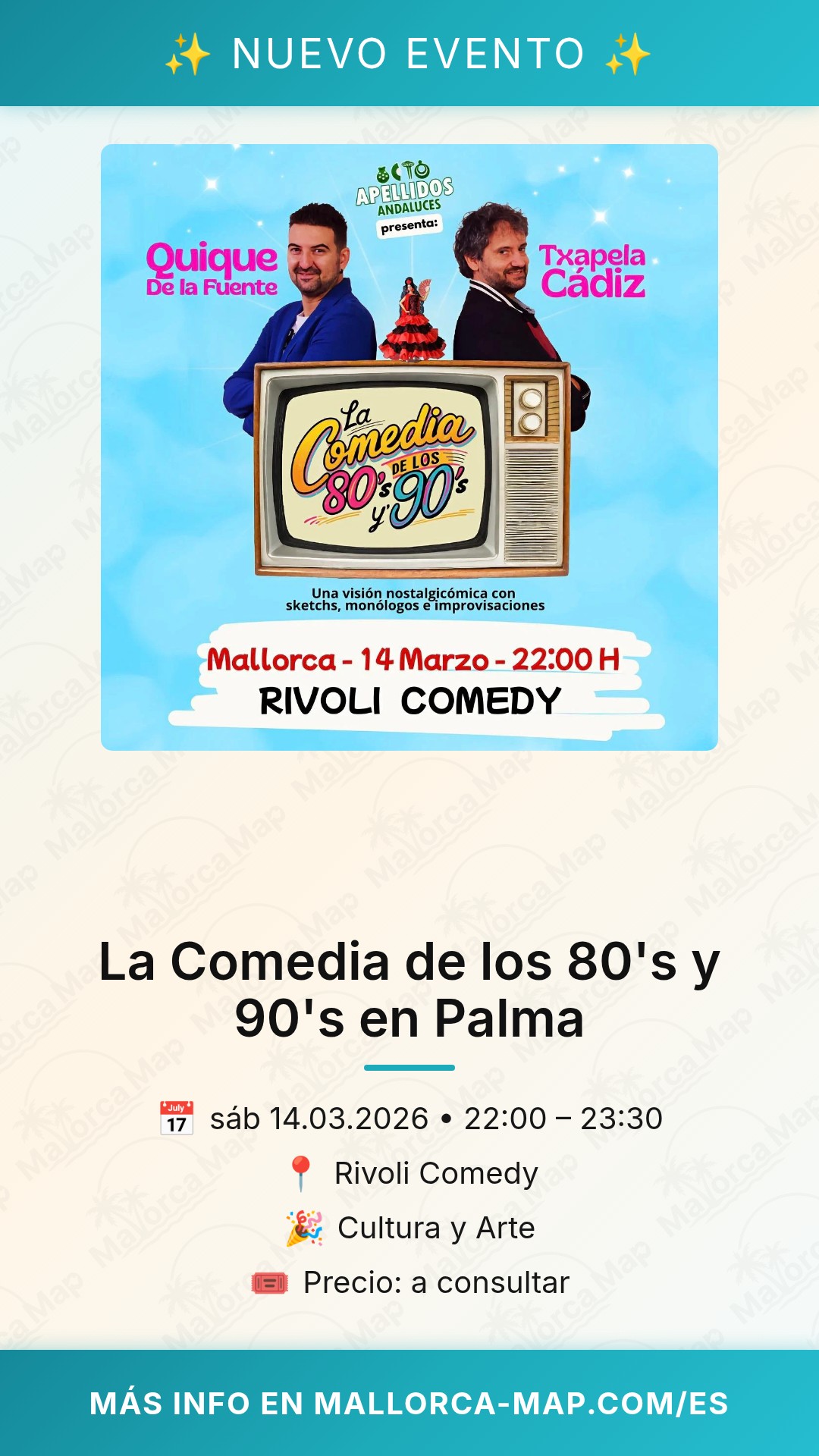 La función comienza a las 22:00, el horario perfecto para cenar algo por la zona de Palma antes de dejarte llevar por el humor más gamberro y entrañable. No dejes pasar la oportunidad de revivir los años 80 y 90 con una sonrisa en la cara. Asegura tu entrada y prepárate para una velada donde la risa es la única regla. ¡Te esperamos para celebrar juntos que cualquier tiempo pasado fue, al menos, mucho más gracioso!