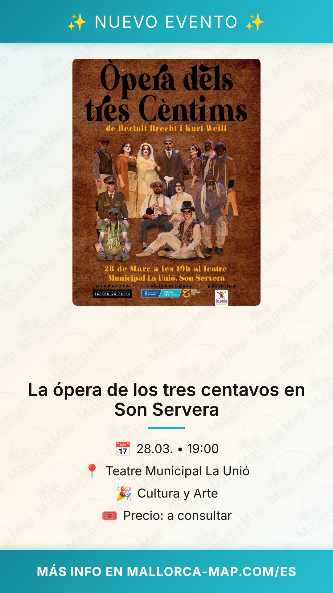 Ubicado en el encantador pueblo de Son Servera, el Teatre Municipal La Unió es el escenario perfecto para acoger esta pieza maestra de Bertolt Brecht y Kurt Weill. Al entrar en este espacio tan querido por los residentes locales, sentirás de inmediato esa atmósfera acogedora y auténtica que solo los teatros con historia pueden ofrecer. Es el lugar ideal para dejarte llevar por la sátira social, el humor ácido y las melodías icónicas que han hecho de esta obra un referente mundial desde su estreno.