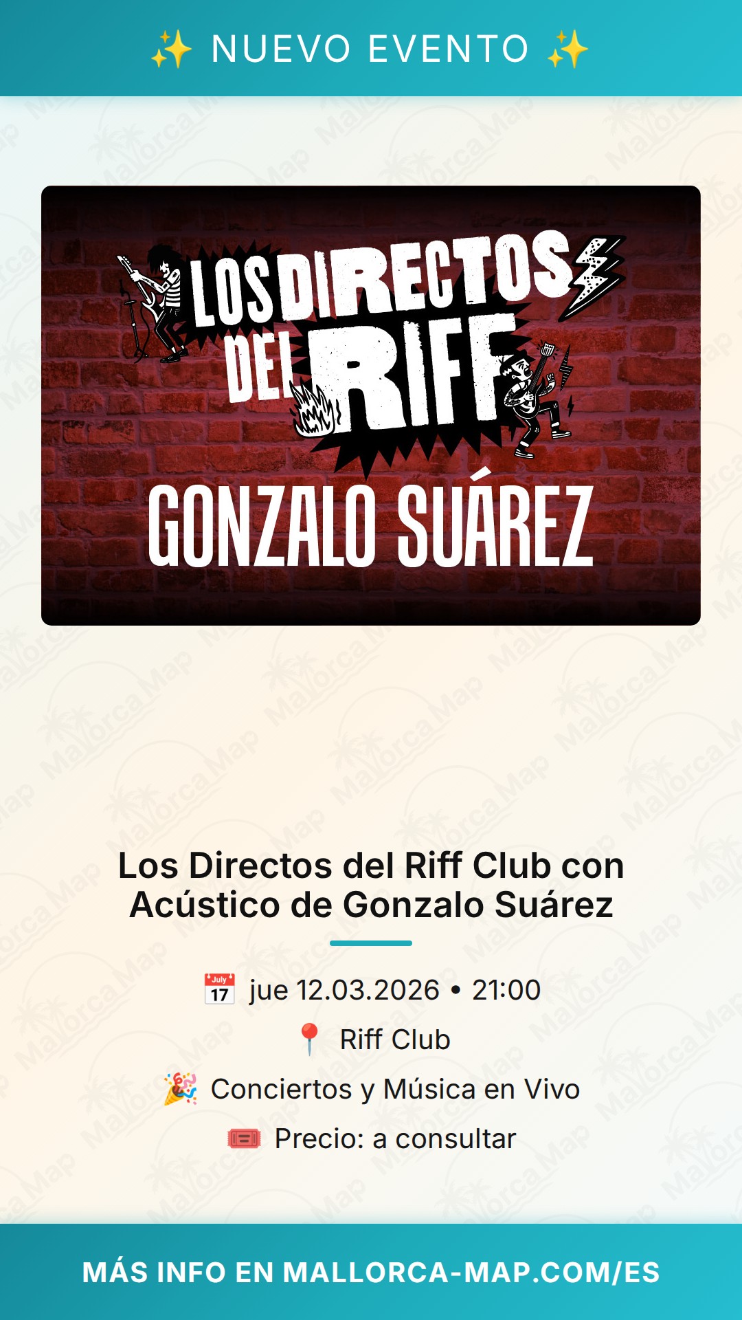 El Riff Club, situado en el corazón del polígono de Son Castelló dentro del complejo de Es Gremi, se ha consolidado como un espacio vital para el talento emergente en Mallorca. Con Los Directos del RIFF, la organización apuesta por generar espacios reales de descubrimiento donde tú, como espectador, puedes conectar directamente con el artista sin filtros. El ambiente de la Sala Zero es perfecto para este tipo de encuentros, permitiendo que la música se viva de cerca y con toda su intensidad.