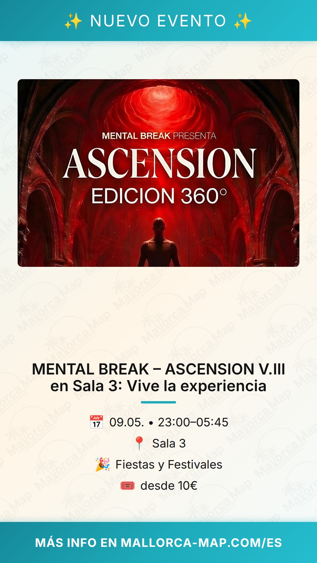 Si buscas una experiencia sonora diferente en Mallorca, no puedes perderte MENTAL BREAK – ASCENSION V.III. Este evento, que tendrá lugar el 9 de mayo de 2026 en la emblemática Sala 3, promete ser una cita ineludible para los amantes de los sonidos más intensos y la cultura de club en la isla. Si eres de los que disfrutan perdiéndose en el ritmo y viviendo la noche al máximo, este es el plan que estabas esperando.