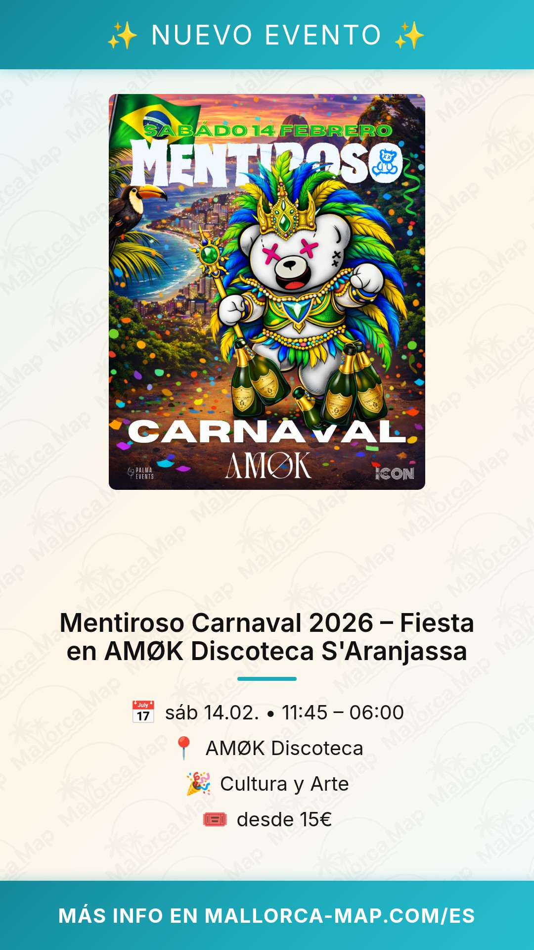 En AMØK Discoteca, en la Carretera de Llevant km 10 en S'Aranjassa, Mallorca, se enciende la noche del 14 de febrero de 2026 con Mentiroso: Carnaval, una fiesta que transforma el carnaval en puro perreo urbano con reggaeton. Olvídate de desfiles tradicionales: aquí se perrea sin parar, con disfraces que revelan más de lo que esconden y una pista donde nadie pasa desapercibido. Looks de infarto y ritmos que aceleran el pulso te esperan desde las 11:45, en el corazón de Mallorca, listo para ser la fiesta del año.