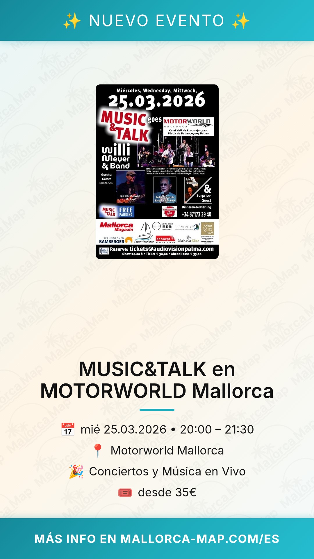 Las entradas ya están disponibles para reserva vinculante. Con un precio de salida de 35 euros, te aseguras un sitio en esta velada que promete ser el tema de conversación en toda Mallorca. No dejes pasar la oportunidad de ser parte de este regreso tan esperado. ¡Estamos deseando volver a verte y compartir juntos la pasión por la música y el motor! Reserva tu entrada hoy mismo y prepárate para vivir una experiencia que despertará todos tus sentidos.