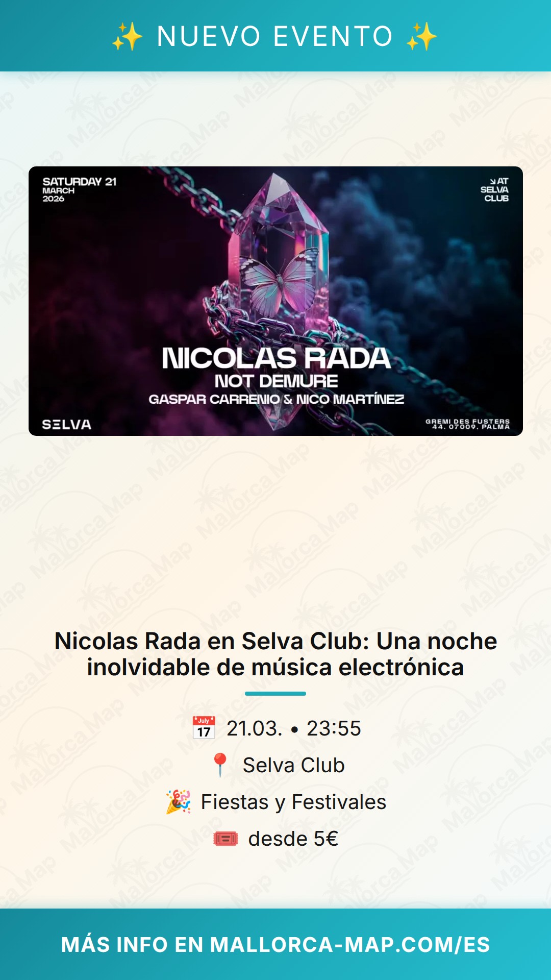 Si buscas una experiencia musical de primer nivel en Mallorca, marca el 21 de marzo de 2026 en tu calendario. El Selva Club se prepara para recibir al aclamado artista Nicolas Rada en una velada diseñada para los amantes de los sonidos envolventes y la energía electrónica de vanguardia. Esta es tu oportunidad perfecta para disfrutar de una atmósfera única en uno de los puntos de encuentro más vibrantes de la isla.