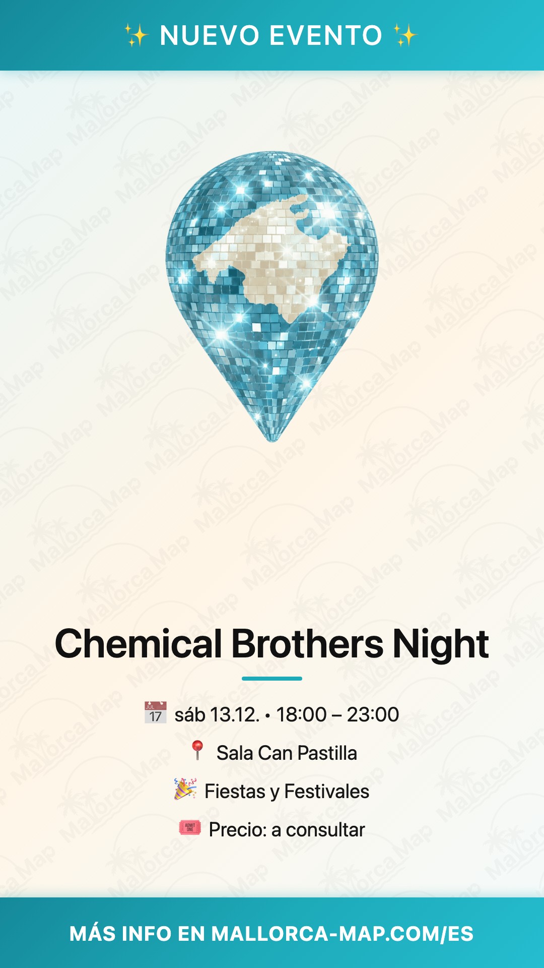 La Noche Chemical Brothers irrumpe en la Sala Can Pastilla de Can Pastilla, Palma de Mallorca, el 13 de diciembre de 2025 a partir de las 18:00. Sumérgete en una fiesta electrizante inspirada en los icónicos sonidos electrónicos de los Chemical Brothers, con los talentosos DJs José Rivera y Arturo Miñues al mando de la pista. Desde el atardecer hasta las 23:00, la sala se transforma en un epicentro de ritmos pulsantes, luces estroboscópicas y una energía que captura la esencia del nightlife mallorquín cerca del aeropuerto de Palma.